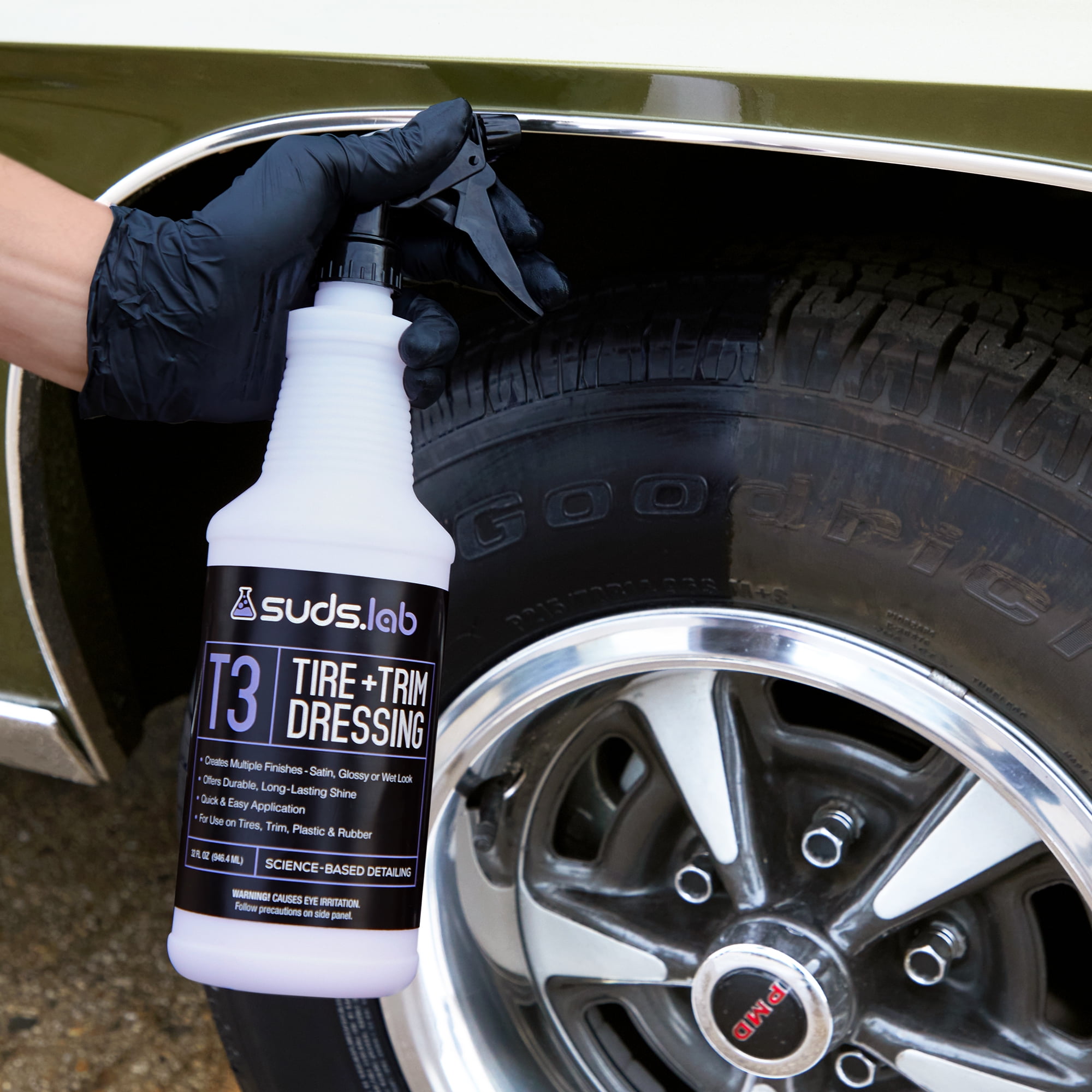 Suds Lab T3 Tire and Trim Dressing has boiled car care down to a science. Through trial and error, we have perfected optimal formulas and solvents that break down road contamination at a molecular level, leaving your vehicle clean, protected, and ready for the road ahead. We’ve done all the research – it’s a smooth ride from here.