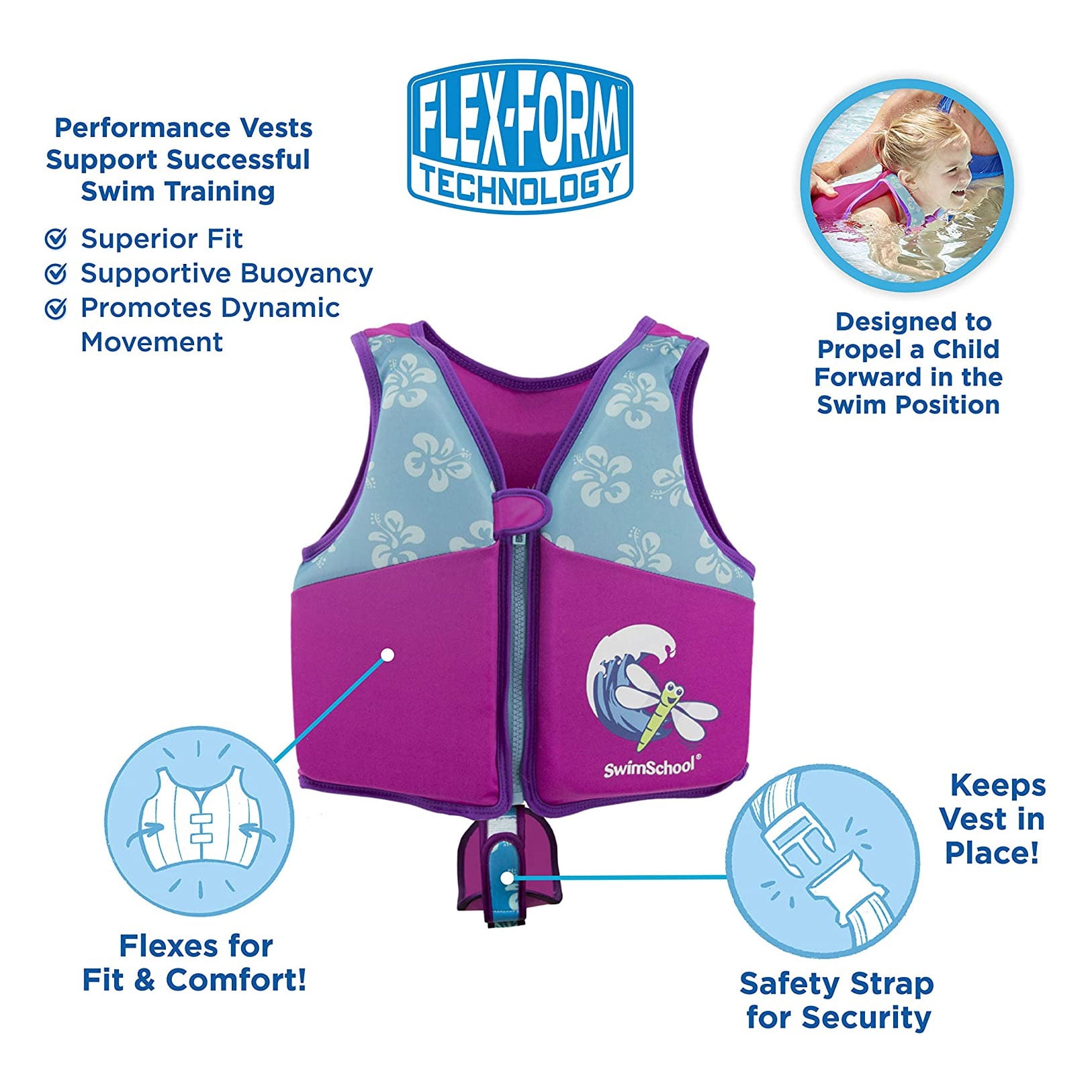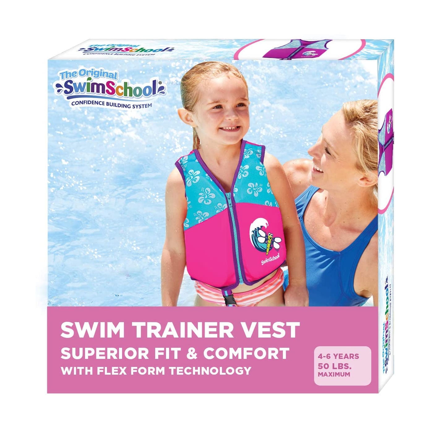 SwimSchool Medium/Large UPF 50 Flex Foam Floatation Swim Trainer Vest, Pink/Aqua