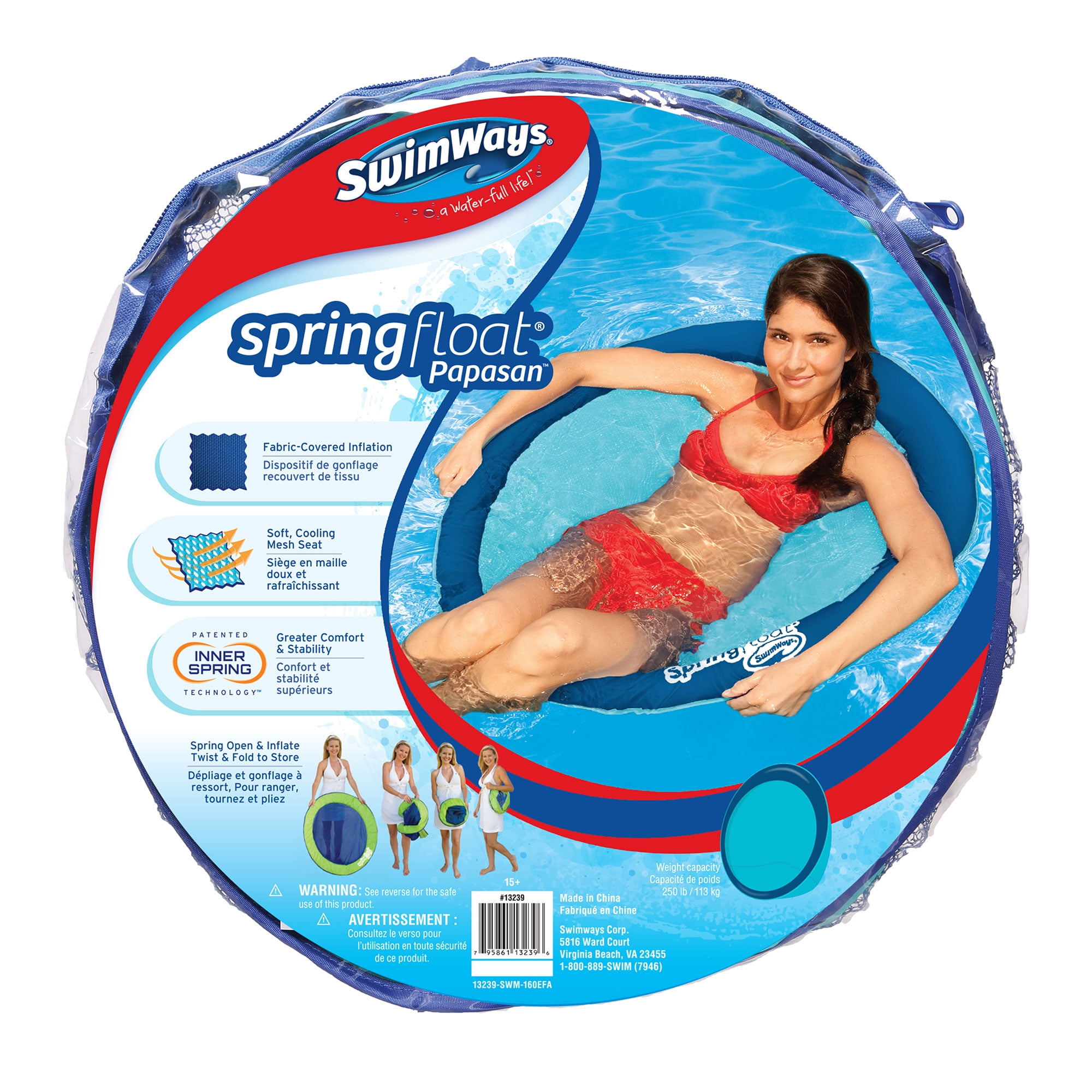 SwimWays Spring Float Papasan is a fabric-covered floating pool chair with a patented inner spring for greater comfort and stability in the water. The soft cooling mesh seat suspends your body just below the surface of the water while the inflatable ring keeps you floating upright. The spring around the outside edge of the float helps to fold the float flat into three compact circles for convenient portability and storage. When folded, the Papasan float fits into most luggage – it’s an excellent choice for travel! The jet valve makes inflation and deflation quick and easy, so you’ll be in and out of the water faster. Carry/storage bag included. Supports most adults up to 250 lb (113 kg). Measures (when fully inflated) 36"L x 35.5"W x 2.5"H (91 cm x 90 cm x 6 cm).
