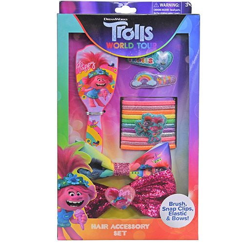 Item Size: 6.75" x 1.5" x 12"Trolls 2 Hair Accessory Set- Printed Plastic Brush, 2 Bows, 2 snap clips, 12 elastics w/charm