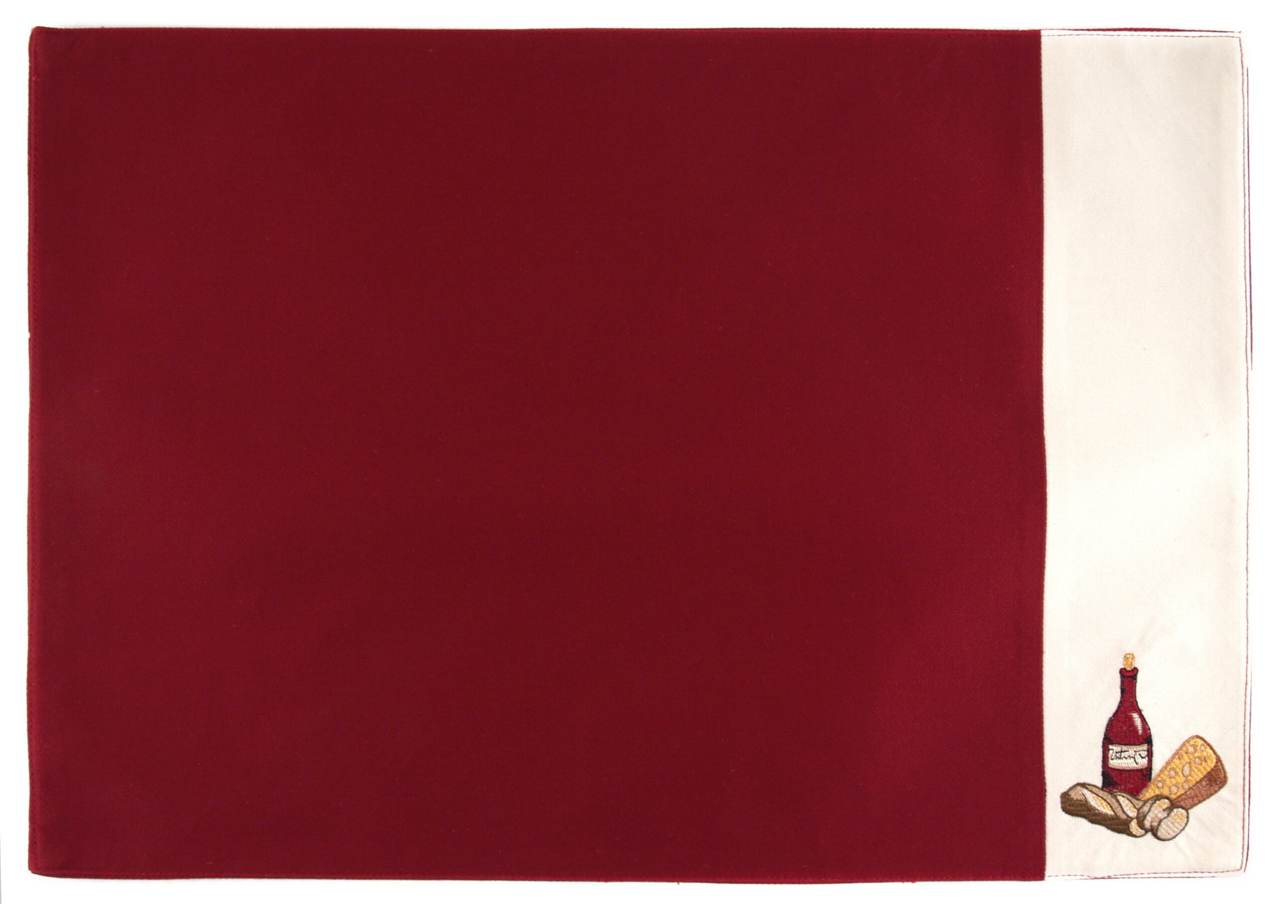 These beautiful placemats would make a great gift for the wine collector. Thick cotton features embroidered wine and cheese on the bottom right corner of the placemat. Elegant and easy to wash, these placemats would be a great addition to any kitchen.Two Burgundy Wine And Cheese Red Placemats