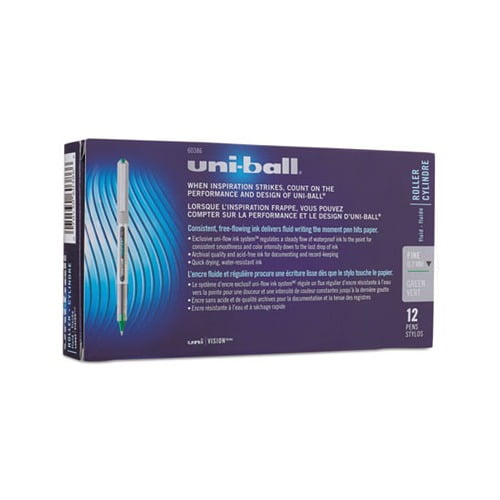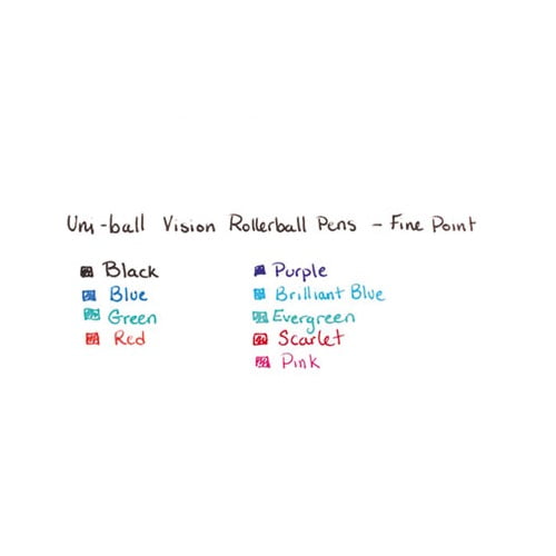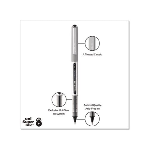 Make your everyday writing easy with the effortless and dependable performance of Vision Rollerball Pens from uni-ball featuring strong, long lasting tips. Capped roller pens deliver an even liquid ink lay-down for reliably smooth, vivid lines and a rich color for improved clarity and readability. Great for all writing tasks from taking notes to record keeping with archival quality, acid free roller ink. Innovative uni Super Ink technology forms an indestructible bond with the paper to minimize the risk of check washing or document fraud, while also protecting from water and fading. The exclusive Uni-Flow Ink System ensures a consistent, delightfully fluid writing experience, and a translucent window ensures that you don’t run out of ink unexpectedly. Enjoy beautiful clean lines and give all of your ideas a burst of brilliant color with this classic style rollerball pen. Pen Sub-Brand & SKU Line: VISION Pen Style: Stick Pen Type: Roller Ball Pen Refillable Yes/No: No.