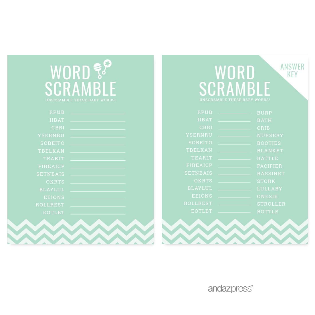 Looking for fun ideas to get everyone to celebrate the arrival of your little one? This fresh and fun baby shower game idea is perfect for both small and large groups of men and women. This is not your run-of-the-mill baby shower game that will induce cringe-worthy reactions and silent internal screams from your guests. It may be cheesy and ridiculous, but this out-of-the-box baby shower game will keep your guests laughing and talking for hours. This is one unique baby shower game that is actually fun (really!) for the mommy-to-be and her special guests. Professionally printed on heavy cardstock, these baby shower game and activity pieces can also serve as a unique framed scrapbook memory of your special day. Don’t forget to get a baby shower prize for the winner – and no, it can’t be a poopy diaper. Made in the USA.Word Scramble Mint Green Chevron Baby Shower Games, 20-Pack
