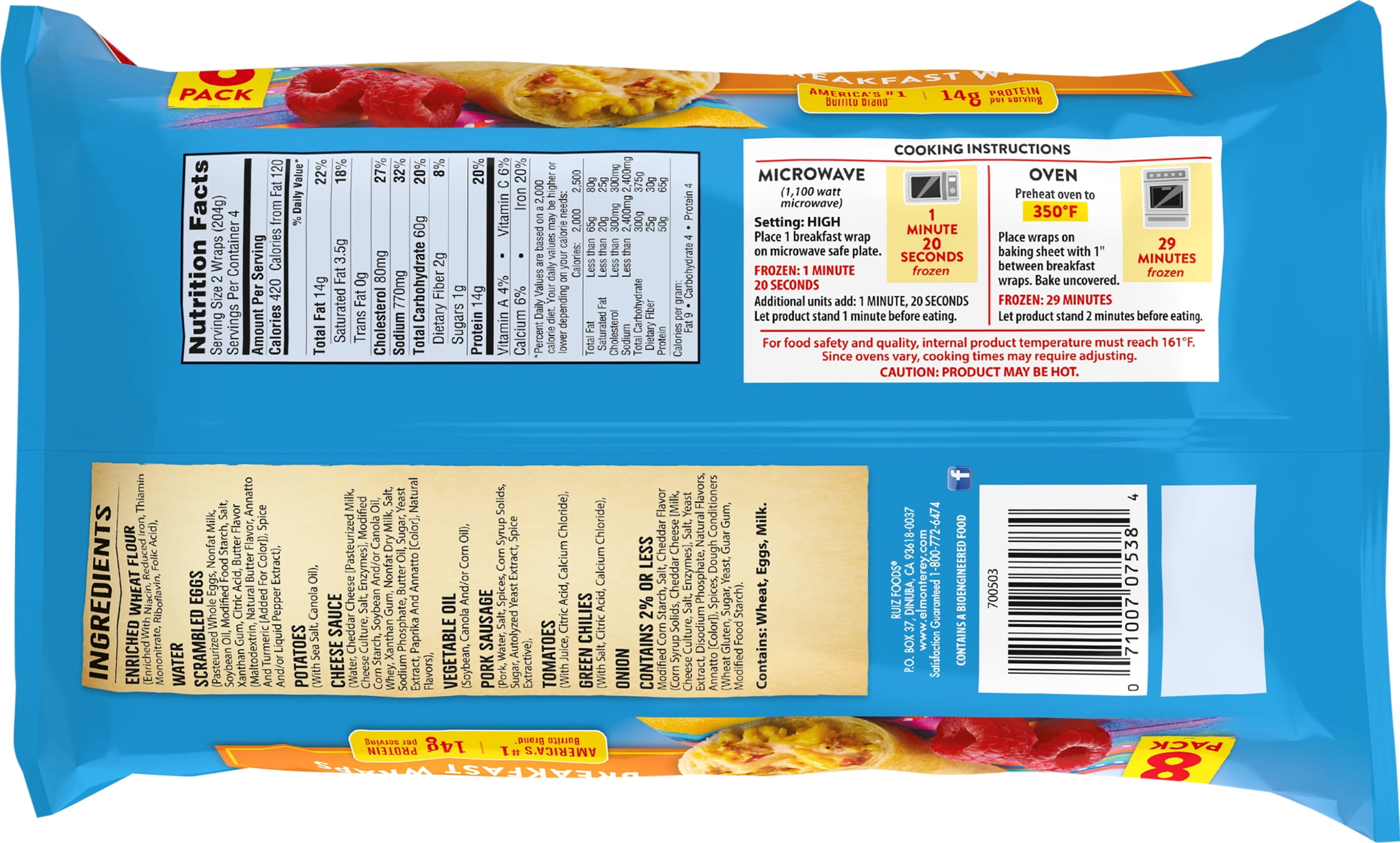 El Monterey Egg, Potato, Cheese Sauce & Sauage Breakfast Wraps, 28.8 oz Family Size, 8 Ct (Frozen)