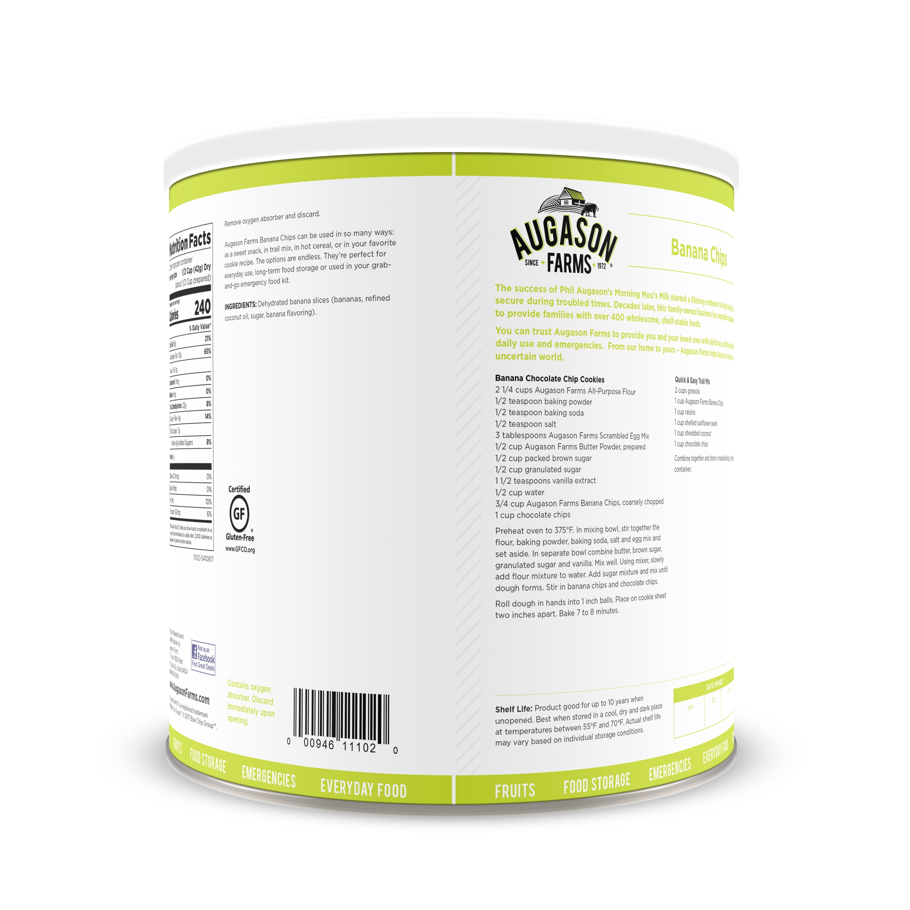 Augason Farms Banana Chips can be used in so many ways: as a sweet and crispy snack, in trail mix, in hot oatmeal or with ice cream. The options are endless! Augason Farms Banana Chips are a favorite for adults and kids of all ages. They?re perfect for everyday use, long term food storage or used in your emergency food kit.