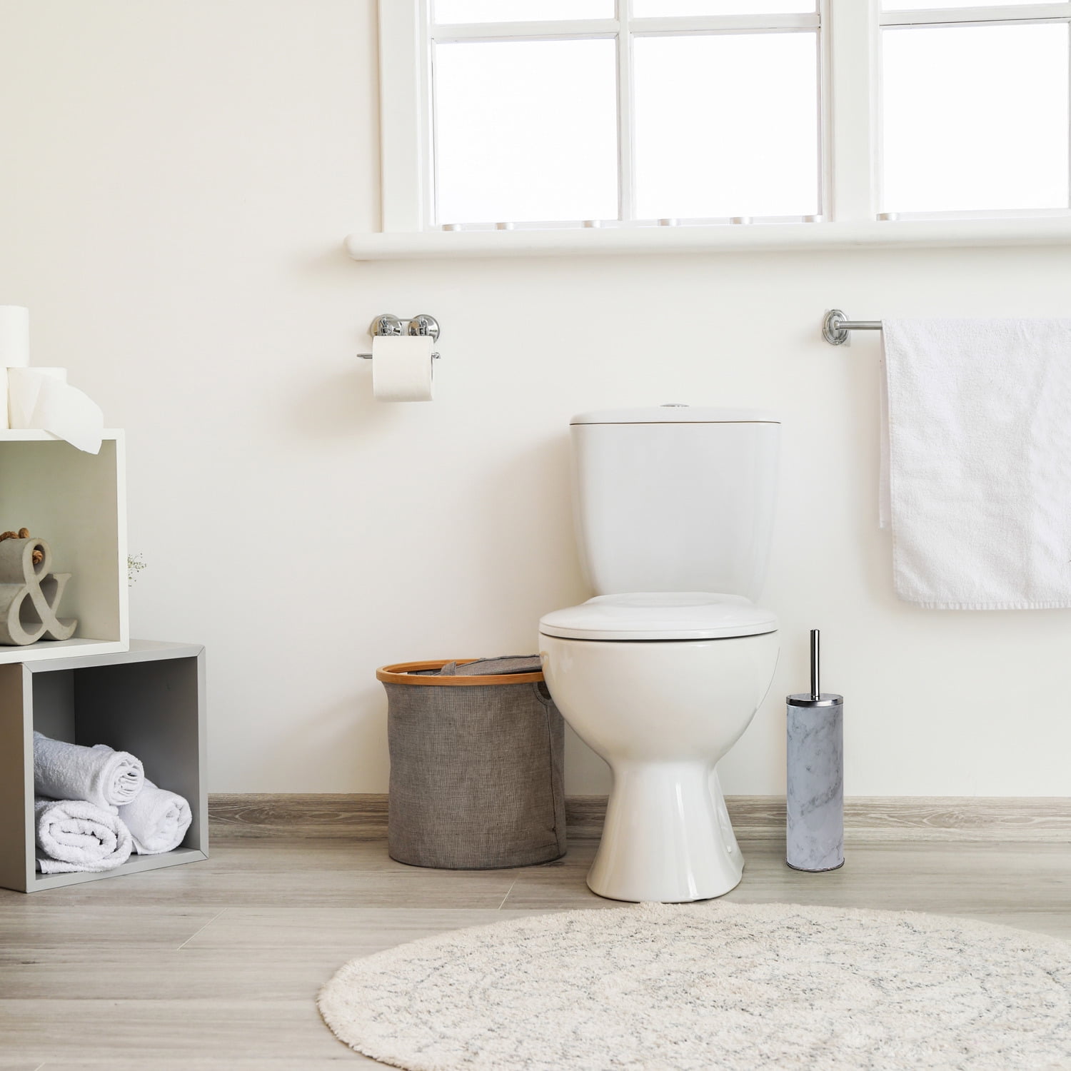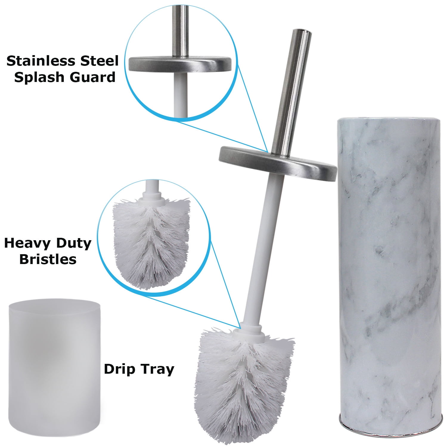 - Dimensions Toilet Brush and Holder 3.75 inch x 3.75-inch x 15.25 inch (L x W x H), Chrome handle and splash guard, Rust-resistant, Includes easy to clean the drip tray, Heavy-duty brush bristles, Design Faux White Marble, Color Off White Marble