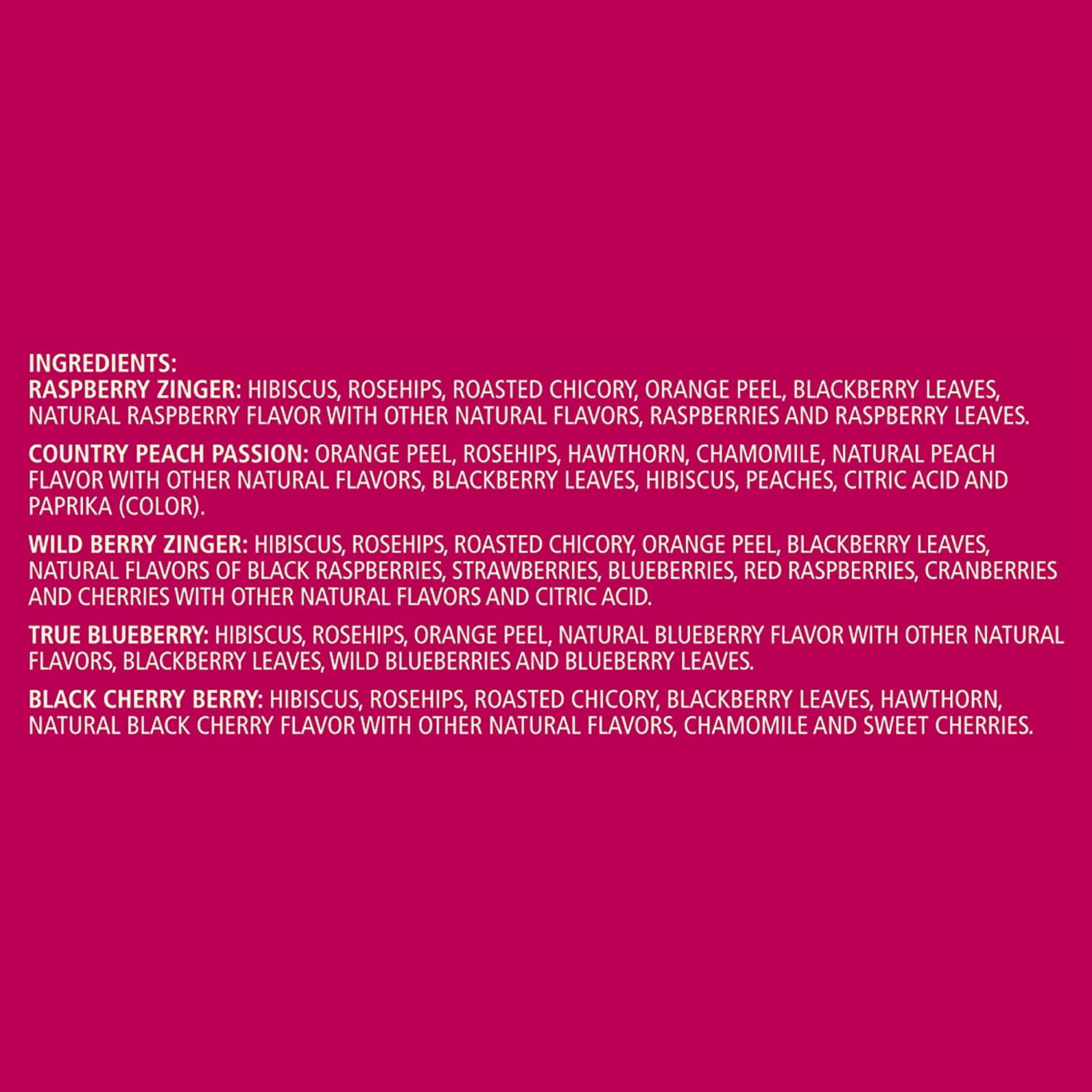 - Contains Raspberry Zinger, Country Peach Passion, Wild Berry Zinger, True Blueberry & Black Cherry Berry