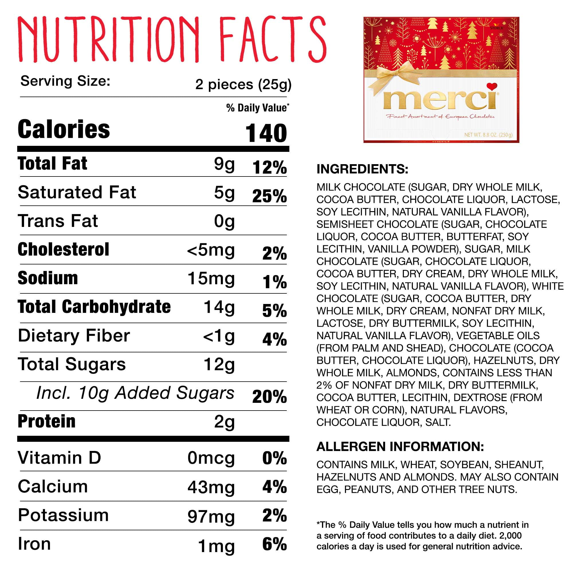 merci Finest Selection of European Chocolates includes 8 flavors of chocolate candy: Milk Chocolate, Hazelnut Almond, Hazelnut Crème, Dark Cream, Dark Mousse, Coffee and Cream, Praline Crème, and Marzipan. merci Chocolate is known as Europe’s famous chocolate gift box, merci offers a chocolate for everyone and is sure to be warmly received. merci Chocolate is a great gift for Christmas and the entire holiday season. Say "Thank you" by placing merci Chocolate under the Christmas tree or in Christmas gift bags. Delicious, carefully selected assorted merci chocolate candy is made in Europe with the finest ingredients. This assorted chocolate gift box is great for including in gift baskets, gift bags and gift boxes.