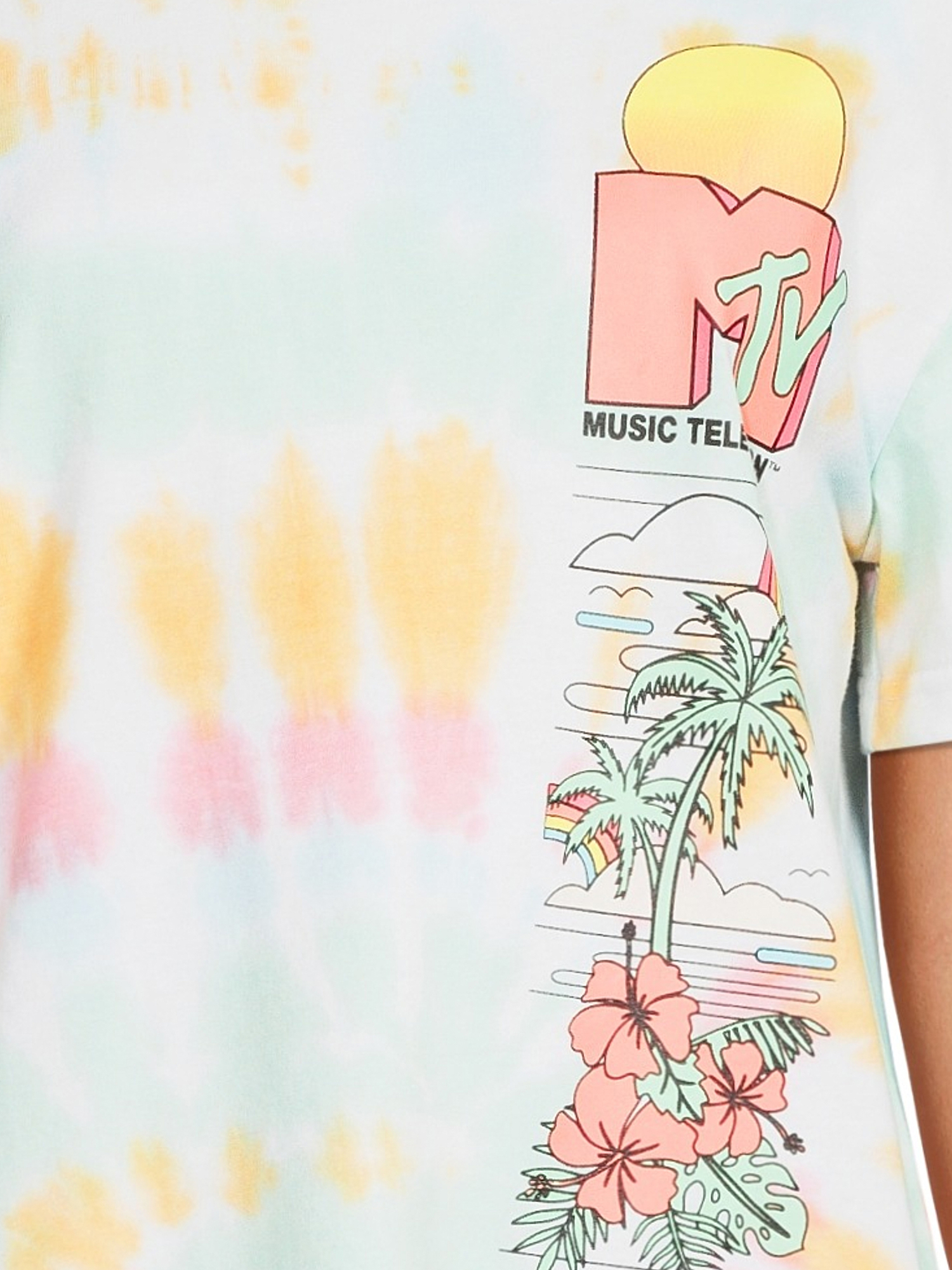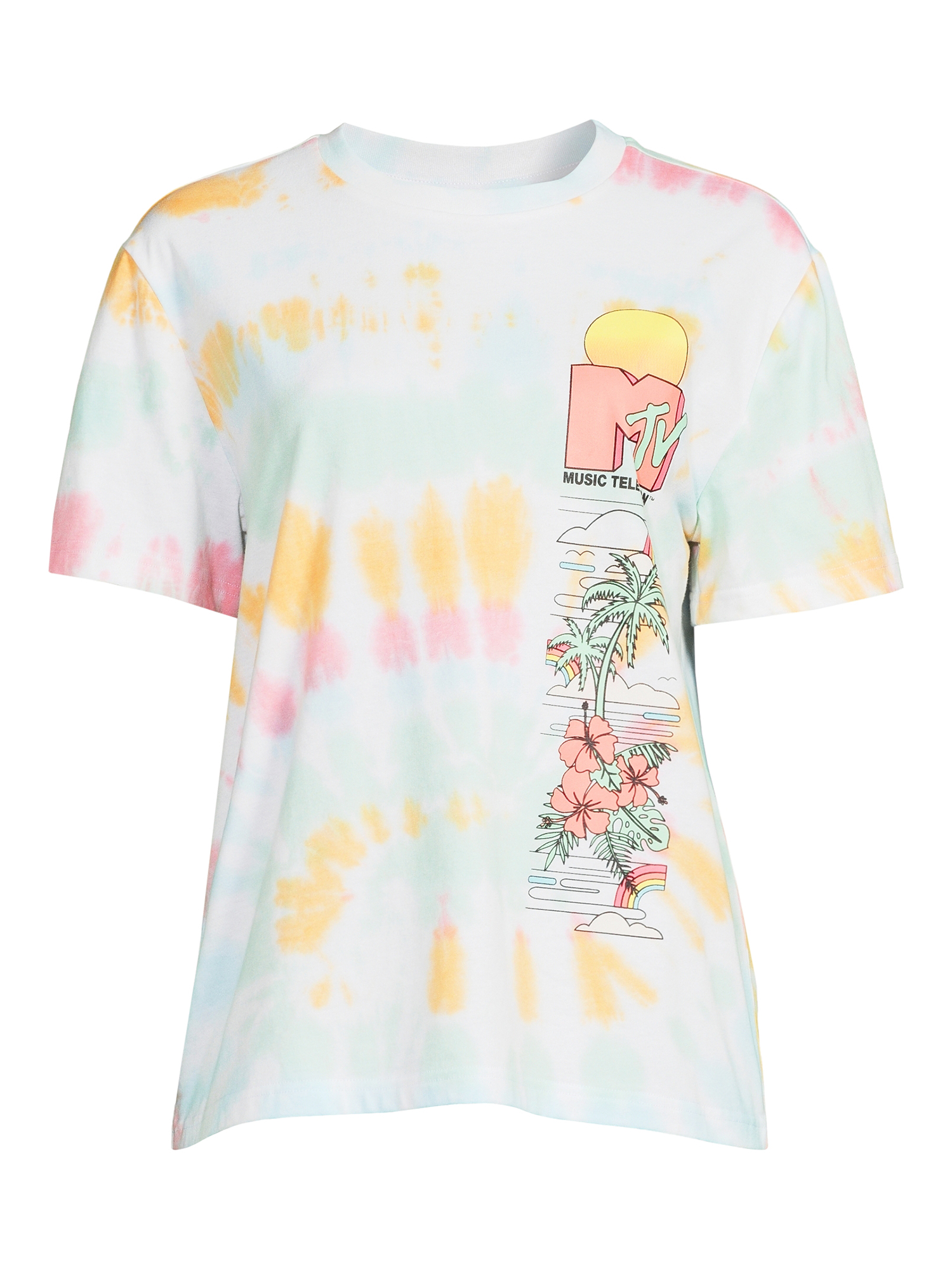 Catch some tropical vibes with this fun and cute MTV Tie Dye T-Shirt! Featuring a multi color tie dye and a relaxed fit, this graphic tee is perfect for showcasing your fandom! Style with comfortable joggers or your favorite jeans and sneakers for a cool, casual outfit.