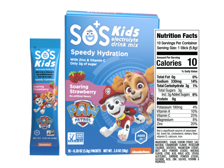 Looking for a kids’ hydration drink without the artificial additives and loads of sugar? Look no further, SOS Kids was created by the SOS Hydration family who wanted a “better for you” drink mix for their own young kids. SOS Hydration Kids Paw Patrol, Low Sugar, Electrolyte Drink Mix, with added Vitamins and Minerals. Help kids stay hydrated without all the sugar. SOS Hydration convenient strawberry mix offers vitamins and minerals like zinc and vitamin C (and only 3g of sugar) to keep active little ones going, plus added encouragement from friendly PAW Patrol characters. To serve, mix 1 stick in 12 oz. of cold water.