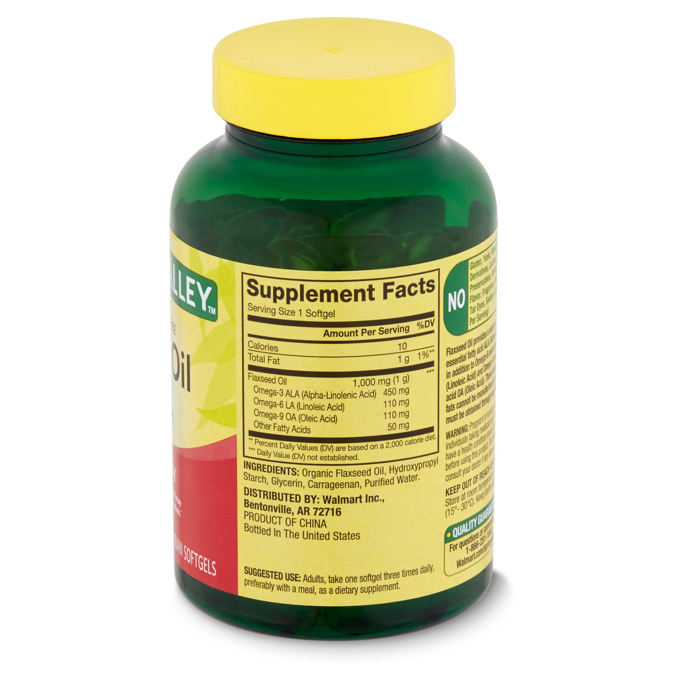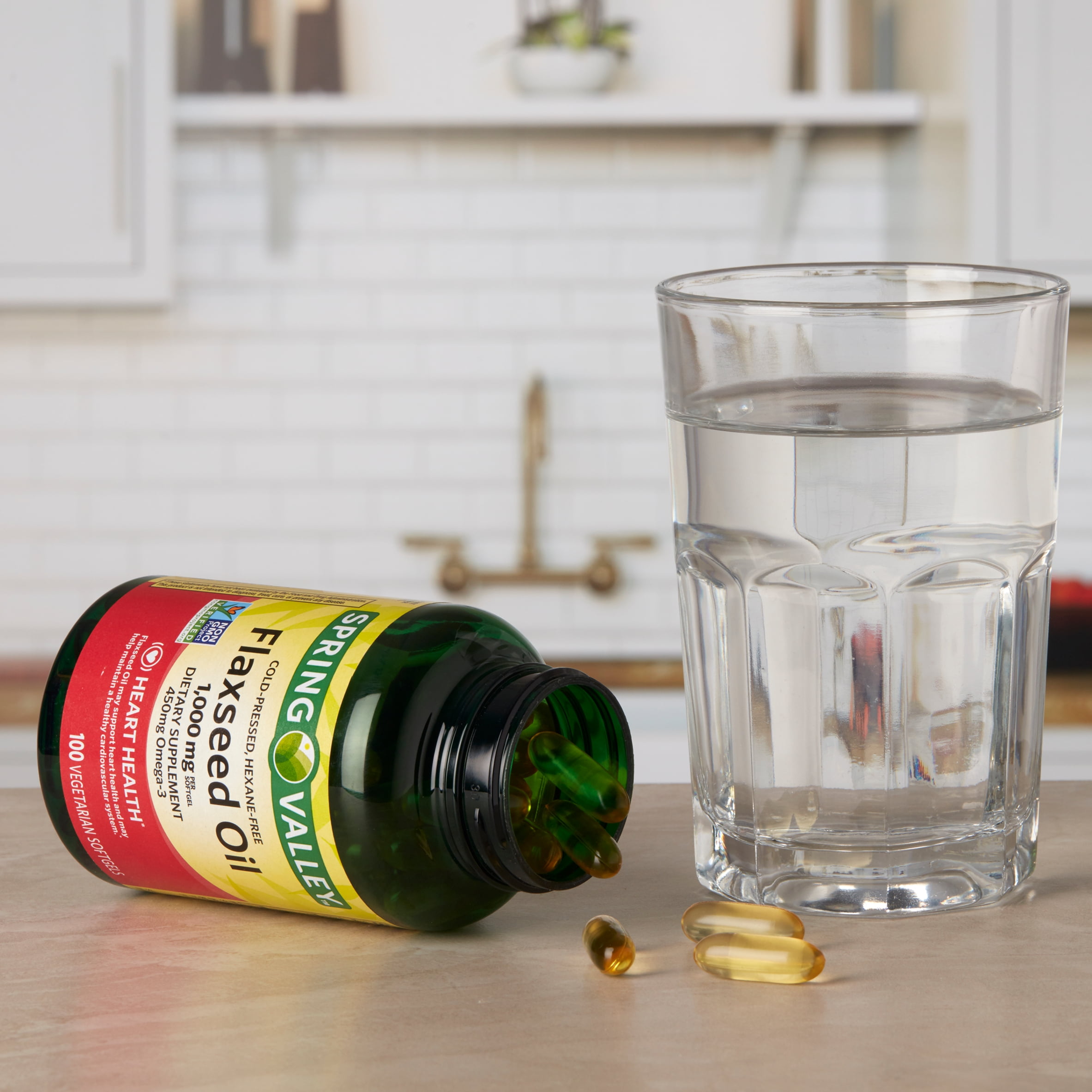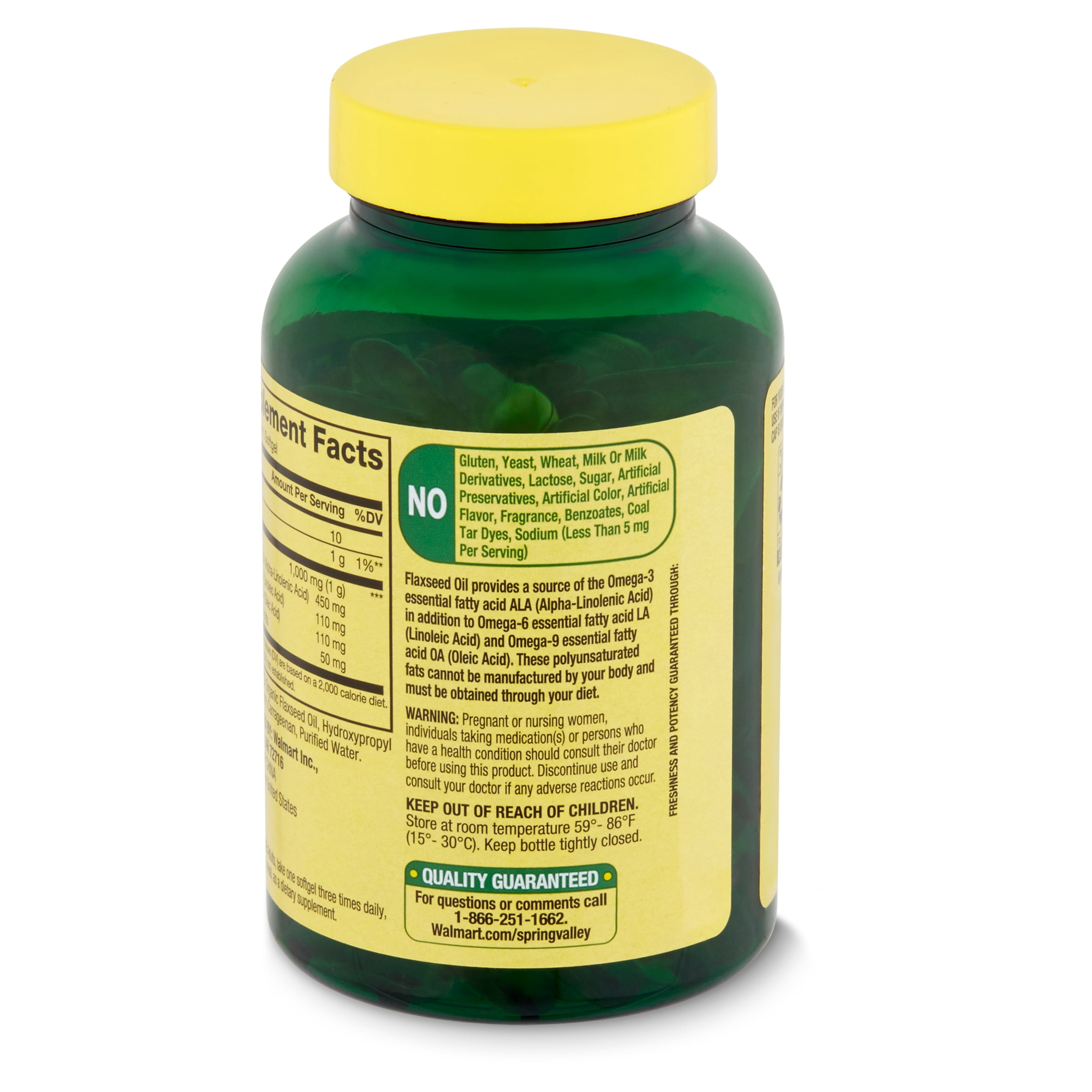 Support your heart health with Spring Valley Flaxseed Oil Dietary Supplement, 1,000 mg. Flaxseed oil provides a source of the essential omega-3, omega-6, and omega-9 fatty acids that cannot be manufactured by the body and must be obtained through your diet. Taking flaxseed oil may support heart health and may help maintain a healthy cardiovascular system. The suggested adult dosage is simply one softgel three times daily, preferably with meals as a dietary supplement. These vegetarian softgels are free from gluten, yeast, wheat, milk or milk derivatives, lactose, and sugar, and they contain no fragrance, hexane, benzoates, coal tar dyes, or artificial preservatives, color, or flavor. You can rest assured that Spring Valley Flaxseed Oil Dietary Supplement, 1,000 mg, is produced with strict quality guidelines and is backed by our quality guarantee.