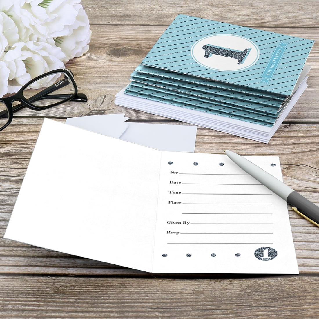 - Fill In Party invitations are professionally printed on heavy-duty card stock paper with a photo-like shine, SIZE 5.5 inches by 3.75 inches, folded. The included envelopes measure 5.75 inches by 3.75 inches. Inside of invitation has space to add your party details: For: Date: Time: Place Given By: RSVP: