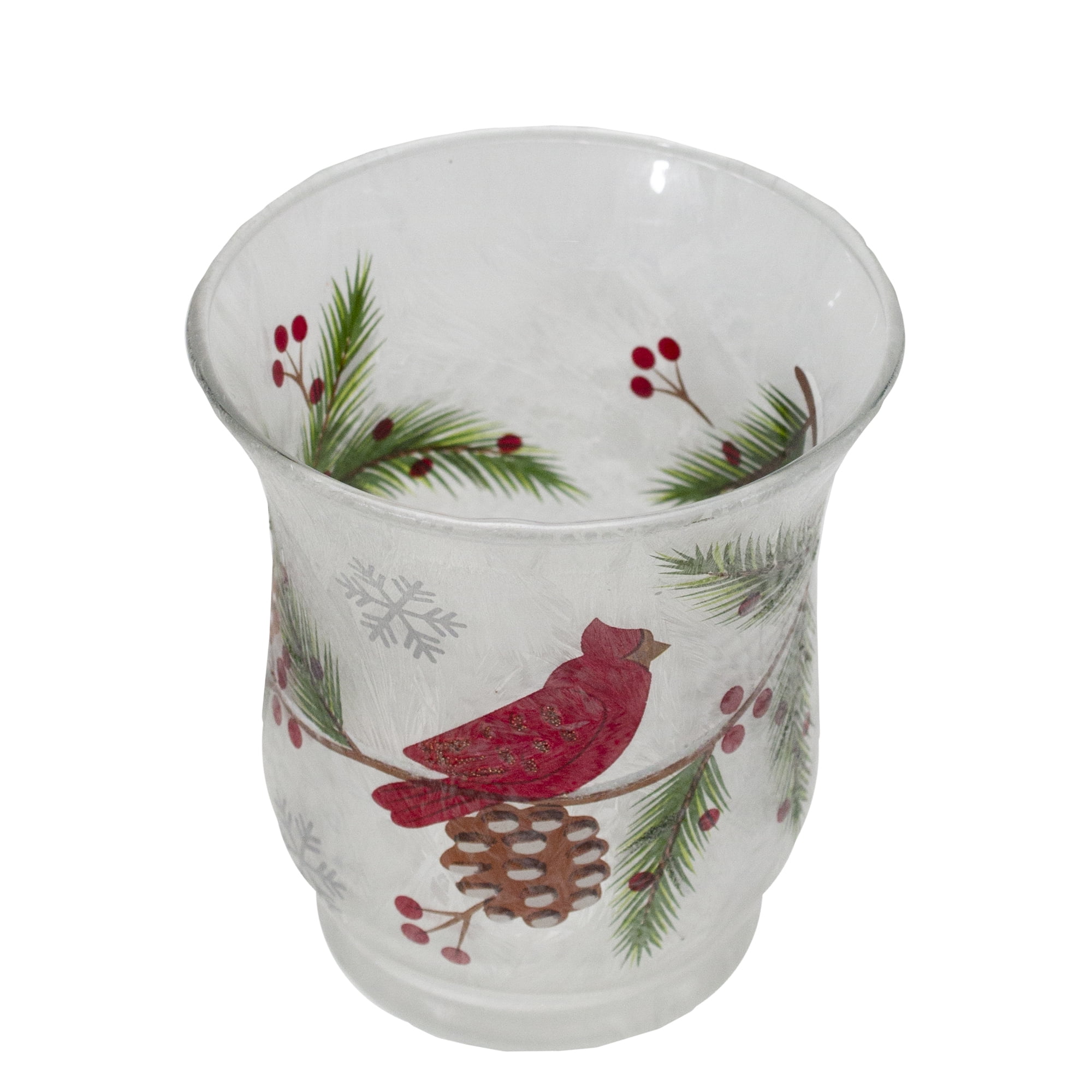2.75′ Hand Painted Christmas Cardinal and Pine Flameless Glass Candle Holder