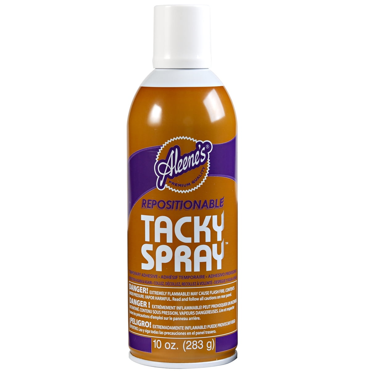 I Love to Create-Aleene’s Repositionable Tacky Spray. This unique formulation dries clear, tacky and best of all is repositionable so you can have a fresh start when you want it! Use it on lightweight applications like poster, wall decor and much more. This package contains one 10 oz can of spray adhesive. Conforms to ASTM D 4236.