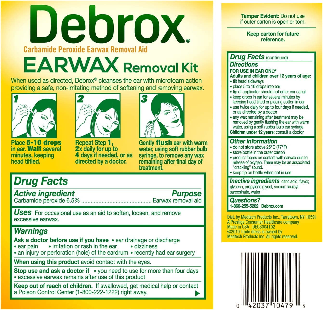 Debrox Earwax Removal Kit includes a soft rubber bulb syringe to rinse your ear after using Debrox Earwax Removal Drops. Excessive earwax build-up can lead to ear discomfort and reduced hearing, which can affect your day-to-day life. Debrox Earwax Removal Drops are a safe and inexpensive in-home solution. Debrox’s gentle, non-irritating microfoam cleansing action goes to work to soften and loosen earwax. When drops are placed in the ear, oxygen is released. This release allows Debrox to foam on contact as it gently softens and loosens earwax. Once broken down, earwax is able to drain from the ear and ears are relieved of built-up earwax so you can return back to daily life without muffled hearing caused by excess earwax. Trust Debrox to help keep your ears – and hearing – clear. Debrox is the #1 doctor & pharmacist recommended brand for earwax removal*. *IQVIA Claim Substantiation Validation Statement, 12/1/18 – 11/30/19; Pharmacy Times 2019 Annual Pharmacists Survey