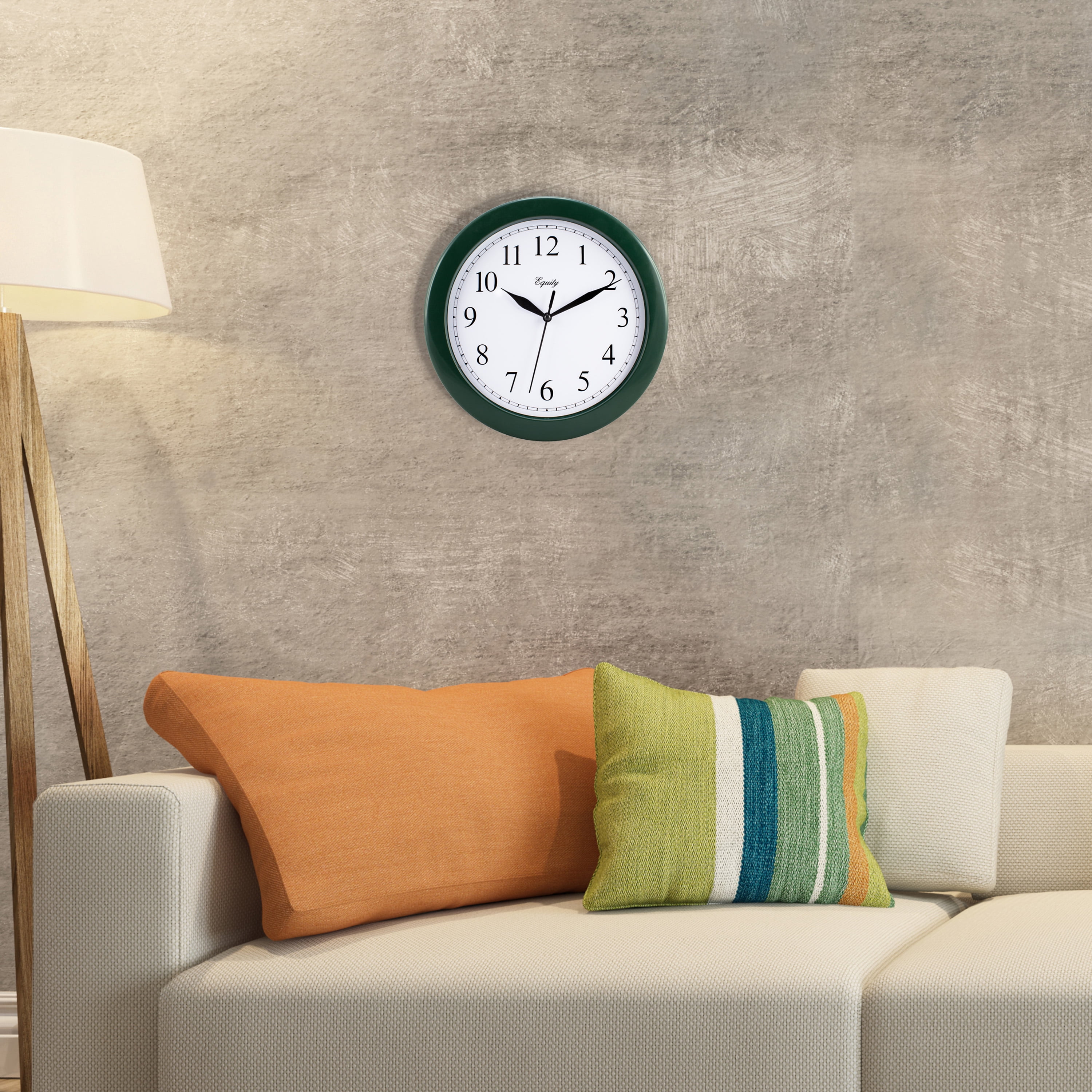 This is a truly modern analog Equity by La Crosse 10" Wall Clock. It is well suited for a kitchen, bedroom or office. This La Crosse wall clock has Arabic numbers that are displayed at all hours and black metal hands. This analog wall clock features a plastic green case and white dial. Operation requires one AA battery. The black metal hands are elegantly styled. The second hand is thin and extends to the outer reaches of the round design to properly point at each individual second.