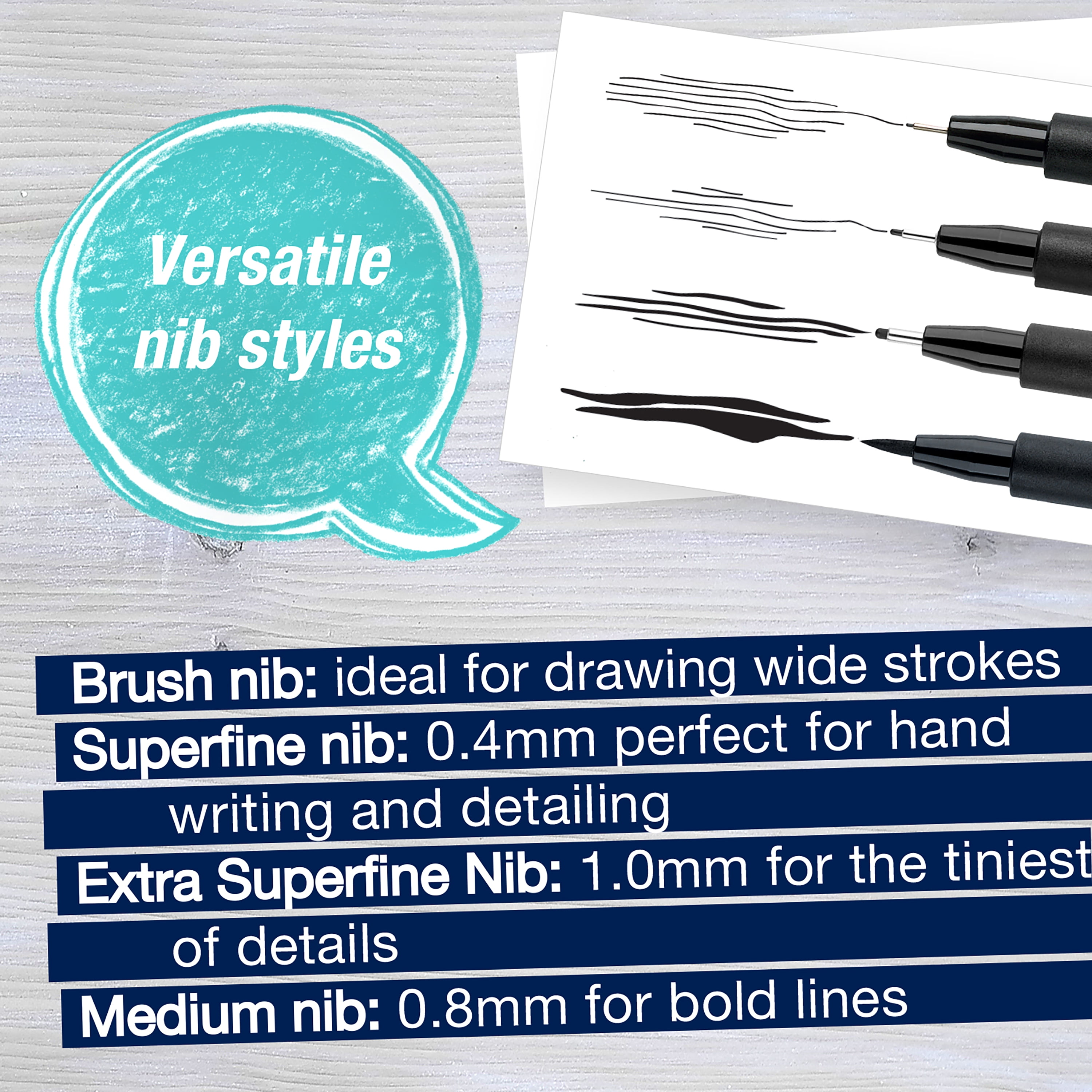 - VARIETY OF NIBS – This adult essential set includes 4 different nib types. Set includes: Brush (works like a paint brush for brush lettering), Medium (0.8mm nib for bold lines), Superfine (0.4 mm nib for detail and handwriting) and Extra Superfine (0.1 mm nib for tiny details).