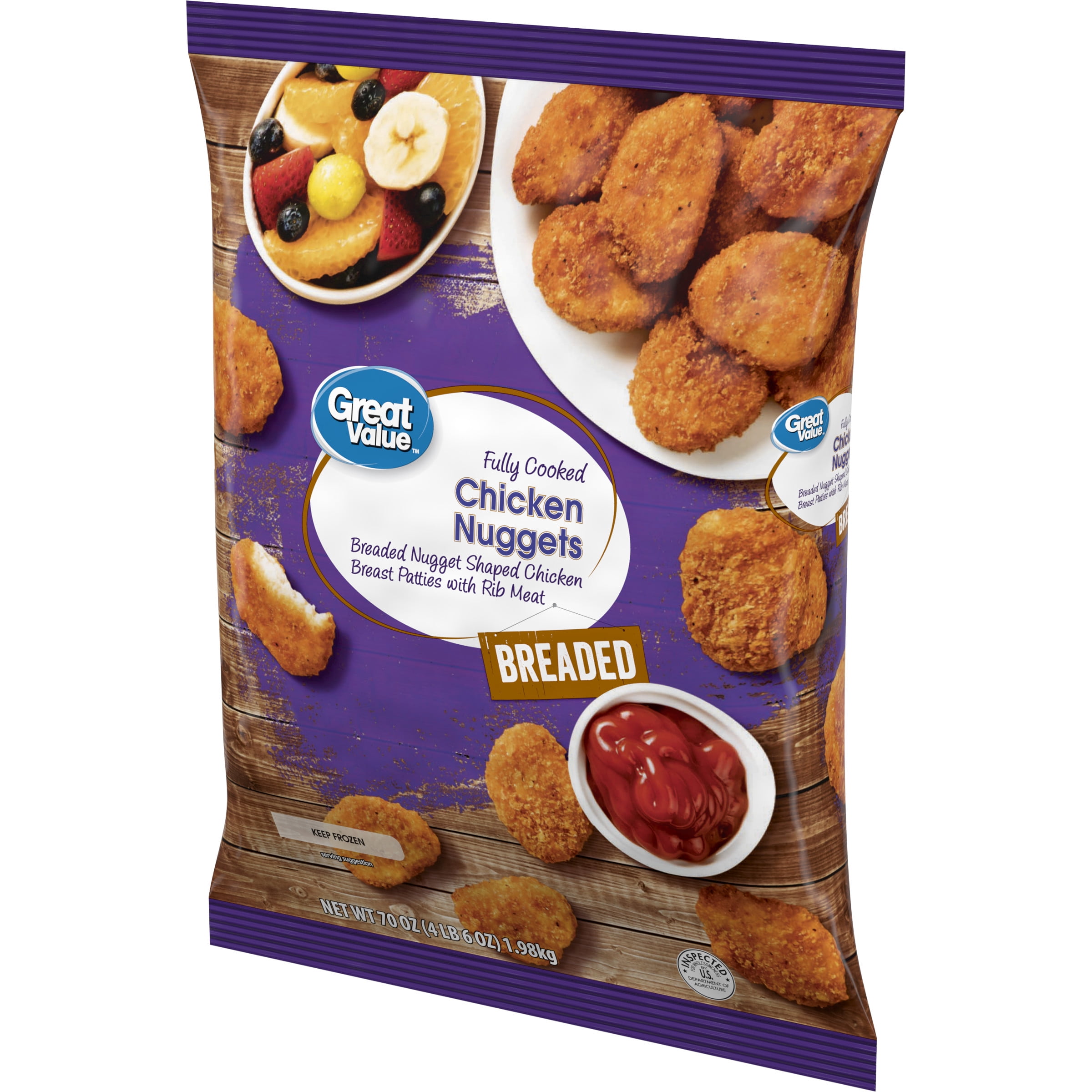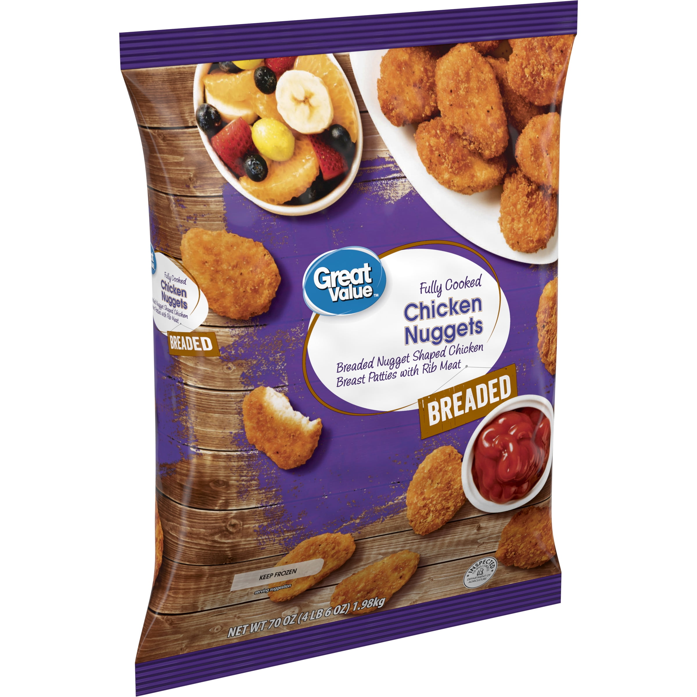 Bring home an easy snack everyone can enjoy with Great Value Breaded Chicken Nuggets. These breaded nugget shaped chicken breast patties with rib meat are easy to prepare in a conventional oven or air fryer. With 11 grams of protein per serving, these breaded nuggets are great finger food for lunch or dinner and make mealtime easy with kids. For a tasty late night snack, serve with your favorite dipping sauce. Includes one 70 oz (4 lb 6 oz) package of fully cooked breaded chicken nuggets.