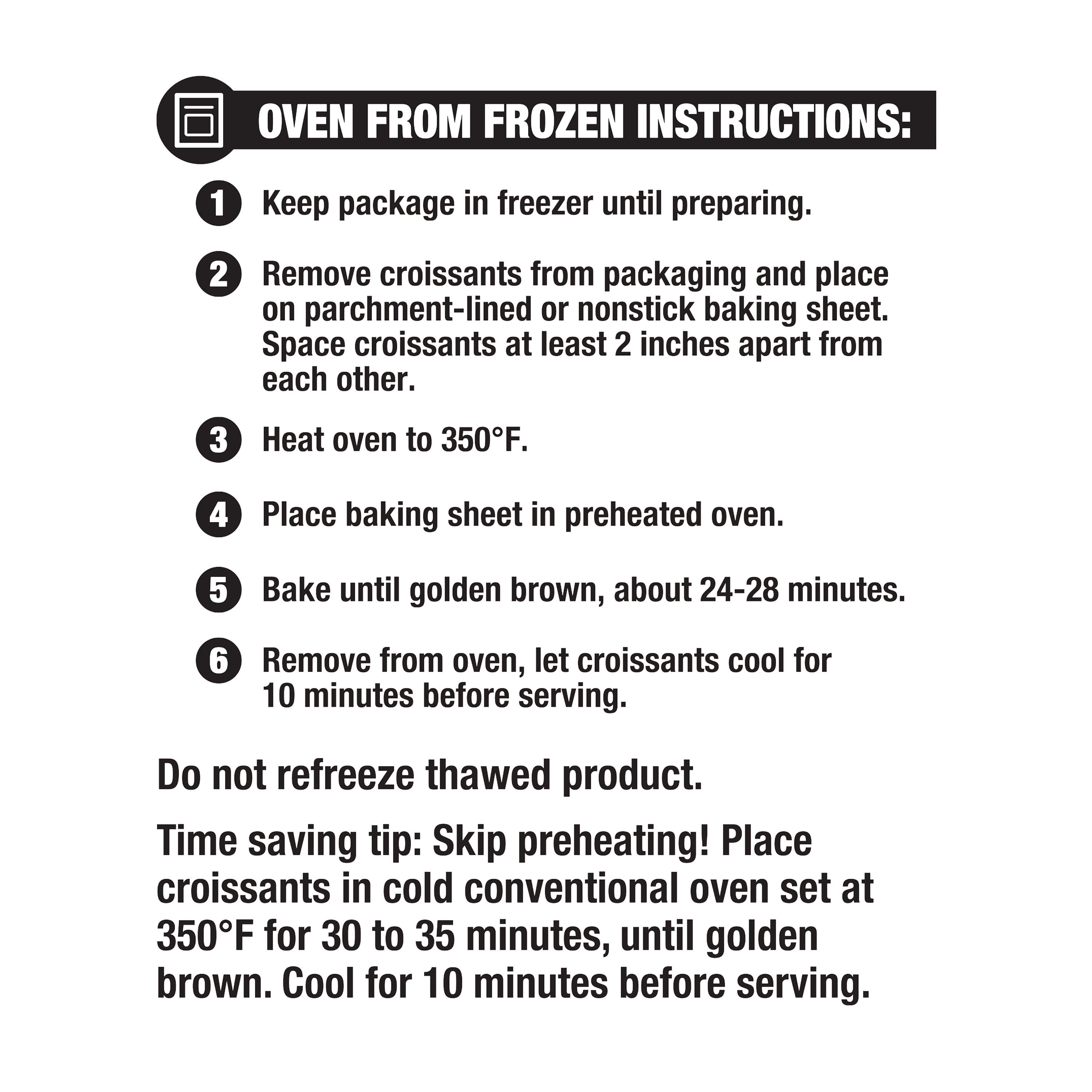 Bake up a delicious treat in no time with Great Value Butter Croissants. These delectably flaky croissants bake from frozen, with no proofing or thawing needed. Just take the frozen croissants out of the freezer, place them on a parchment-lined baking sheet, and bake for 24 to 28 minutes. You can even skip preheating the oven- place the frozen croissants into a cold oven set at 350 degrees F for 30 to 35 minutes, cool for 10 minutes, and enjoy! Enjoy delectable, flaky croissants fresh from your oven with Great Value Butter Croissants.