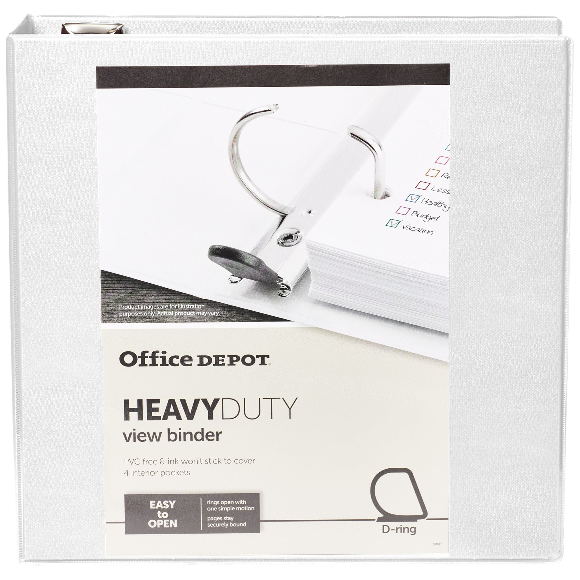 Ensure your paper work is organized and protected with this Office Depot heavy-duty D-ring binder. Compatibility with standard three-hole punched pages makes it easy to gather your papers for storage, while the binder board construction delivers durability to handle the workday or multiple classes. Featuring nonstick polypropylene covers, this Office Depot heavy-duty D-ring binder resists ink transfer to keep your writing clear and readable. Nonstick polypropylene covers resist ink transfer. Heavy-duty binder boards add strength and durability. Office Depot heavy-duty binders’ wide front and back binder panels fully cover divider tabs and sheet protectors. Four clear interior pockets provide space to stash loose sheets of paper. 3" rings holds up to 650 sheets. Contains Recycled Content – See Specs for Details