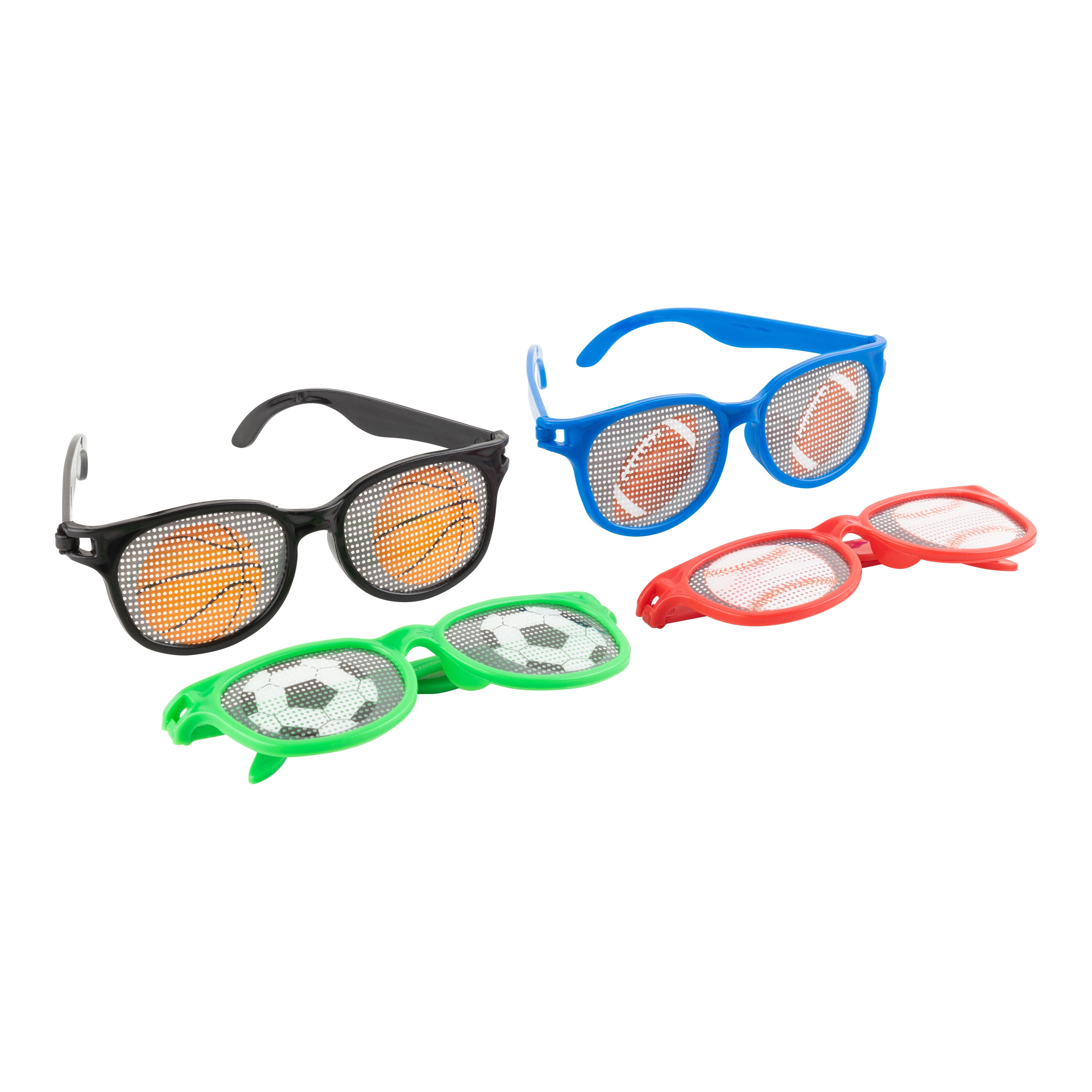 Throw on a pair of these fun unisex multicolor sport printed glasses. They are perfect for your little sports theme party. The lenses are printed and you can see through them with frames made of plastic material. There are 4 pairs of novelty glasses included with 1 basketball with black rims , 1 soccer ball with green rims, 1 baseball with red rims and 1 football with blue rims design. These glasses are perfect for giving away as a party favor or as a photo prop.
