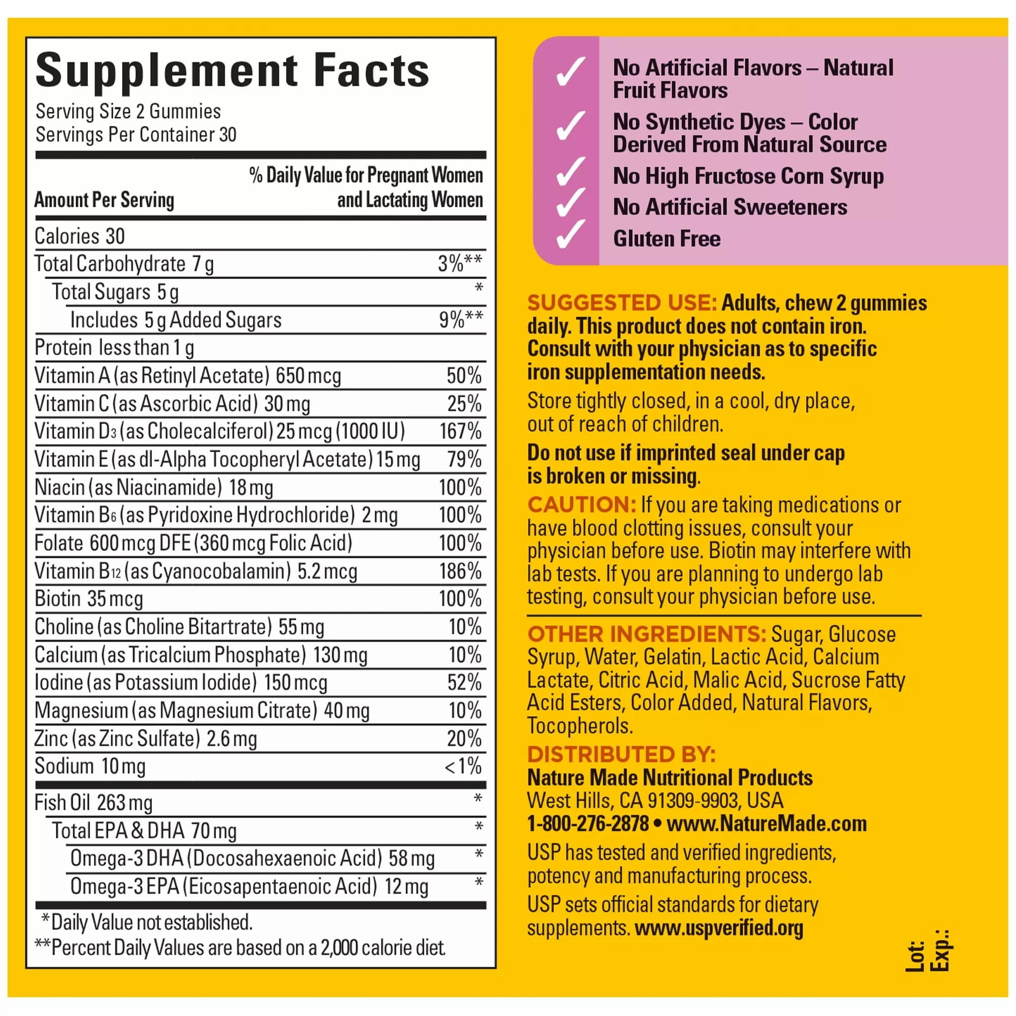 - FIRST PRENATAL GUMMIES WITH A GOOD SOURCE OF CHOLINE: Nature Made Prenatal Gummy Vitamins were the first prenatal gummies to offer a good source of Choline, an essential nutrient that supports baby’s brain and spinal cord development.