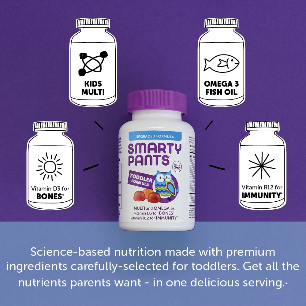 SmartyPants Toddler Formula gummies are packed with over 15 premium nutrients including omega-3 EPA and DHA essential fatty acids (sourced from sustainably-sourced wild caught, small fish), vitamin D3 for bones, vitamin B12 for immunity, vitamin A for eyesight, and folate as methylfolate — all in one delicious gummy without any of the junk.SmartyPants Toddler Formula is non-GMO, gluten-free and free of synthetic colors, artificial flavors or sweeteners. Toddler Formula is specially-formulated based on the latest scientific research to fill average nutrient gaps in the average toddler’s diet and includes the premium forms of nutrients your body prefers, whenever possible.