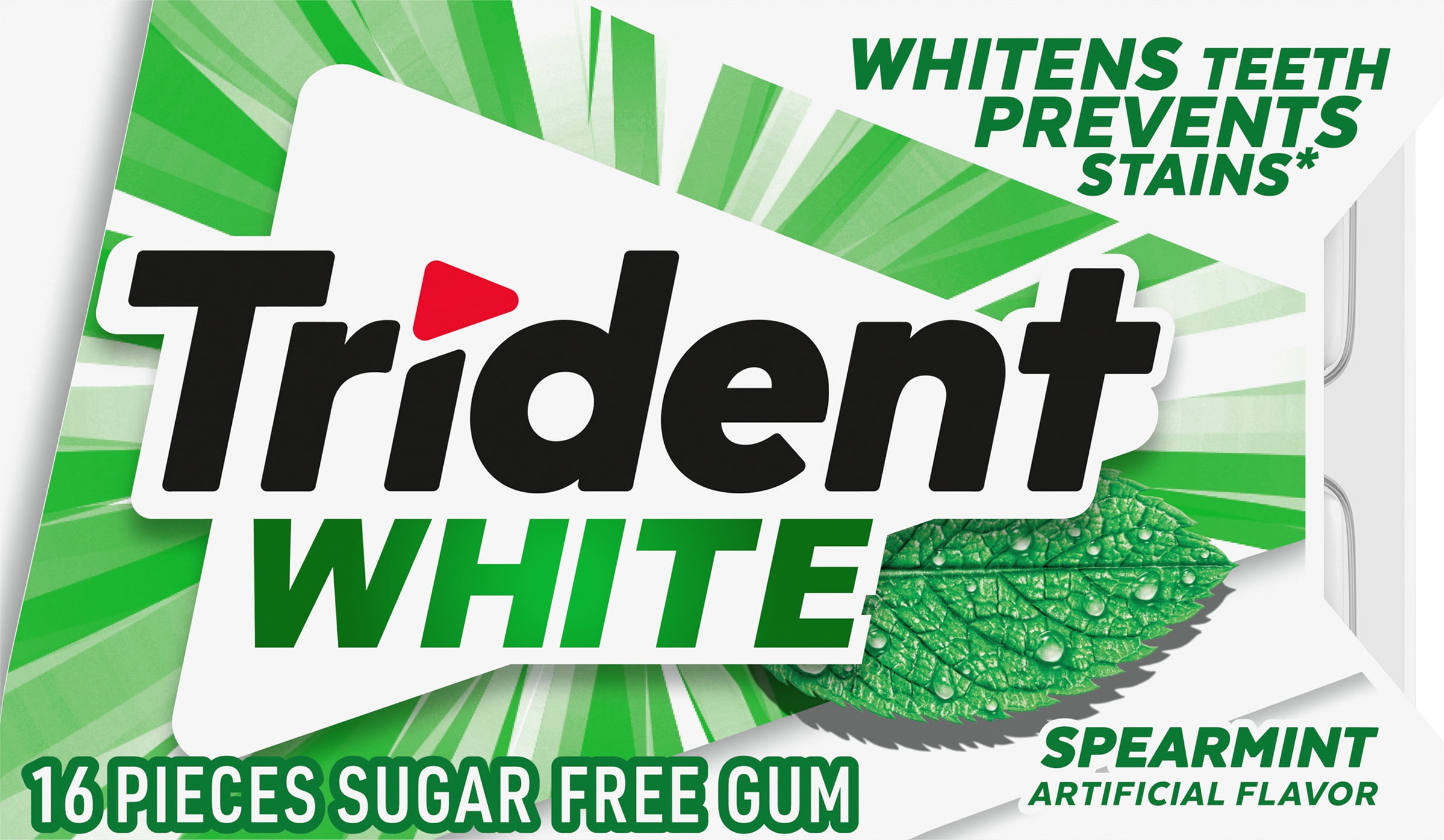 Whiten teeth and get close-up confidence with Trident White Sugar Free gum, the easy way to freshen breath and help protect against tooth decay. Chewing two pieces of Trident White Sugar Free Gum after eating and drinking helps whiten teeth in as little as four weeks. With 30% fewer calories than sugared gum, Trident White has long lasting flavor, fights plaque, and restores your mouth’s pH balance to maintain a healthy smile. Pop a piece of mouthwatering Minty Bubble Trident White for a refreshing taste that keeps going as long as you do.Trident White Spearmint Sugar Free Gum, 16-Piece, 9 Count
