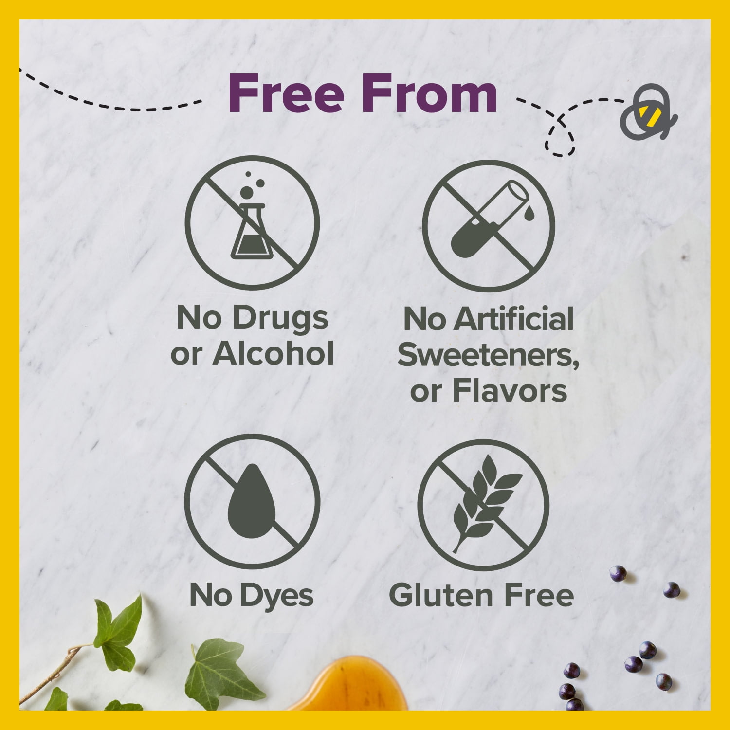 - Free of drugs, alcohol, artificial sweeteners, artificial flavors, and gluten