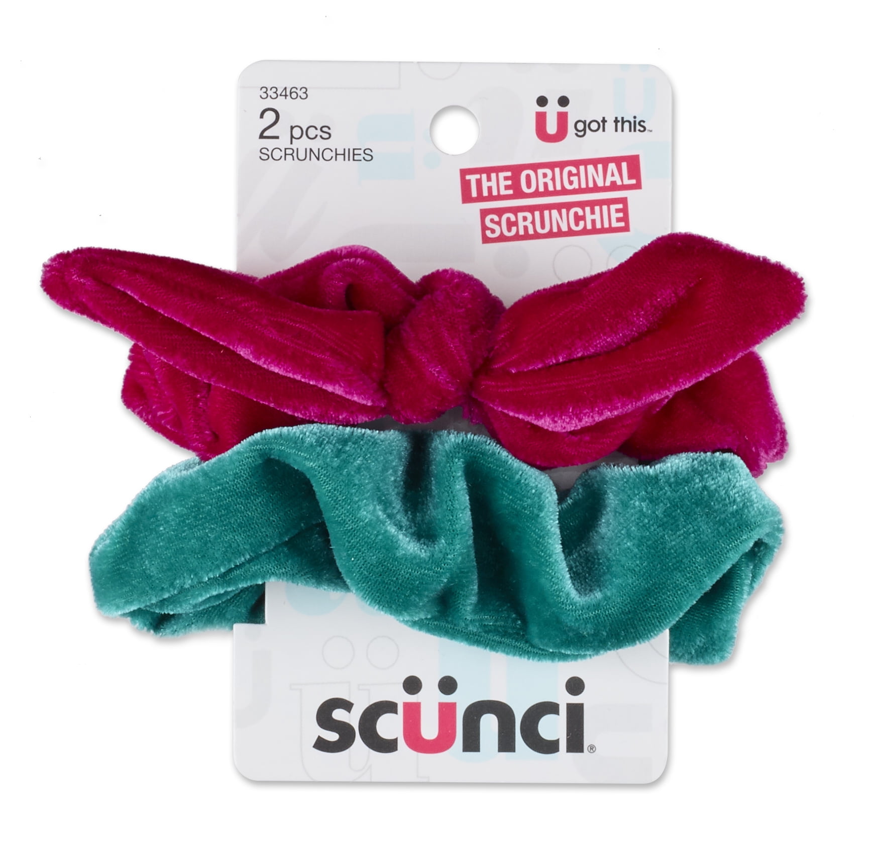 Scunci Original Scrunchies in Velvet Texture in Teal Green and Dark Pink Jewel Tones, 2ct