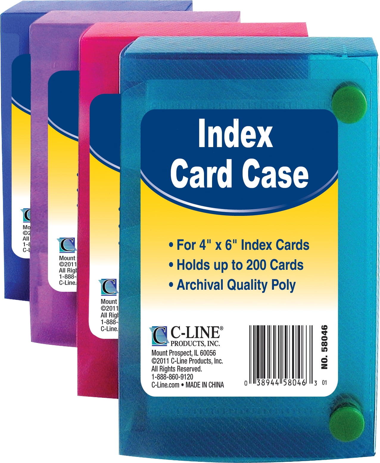 Keep your index cards organized. * Durable polypropylene card case holds up to 200 4 x 6 inch index cards * Features snap closure and includes 5 dividers and adhsve label tabs * Acid-free, archival quality polypropylene * Assorted colors include blue, aqua, purple, pink