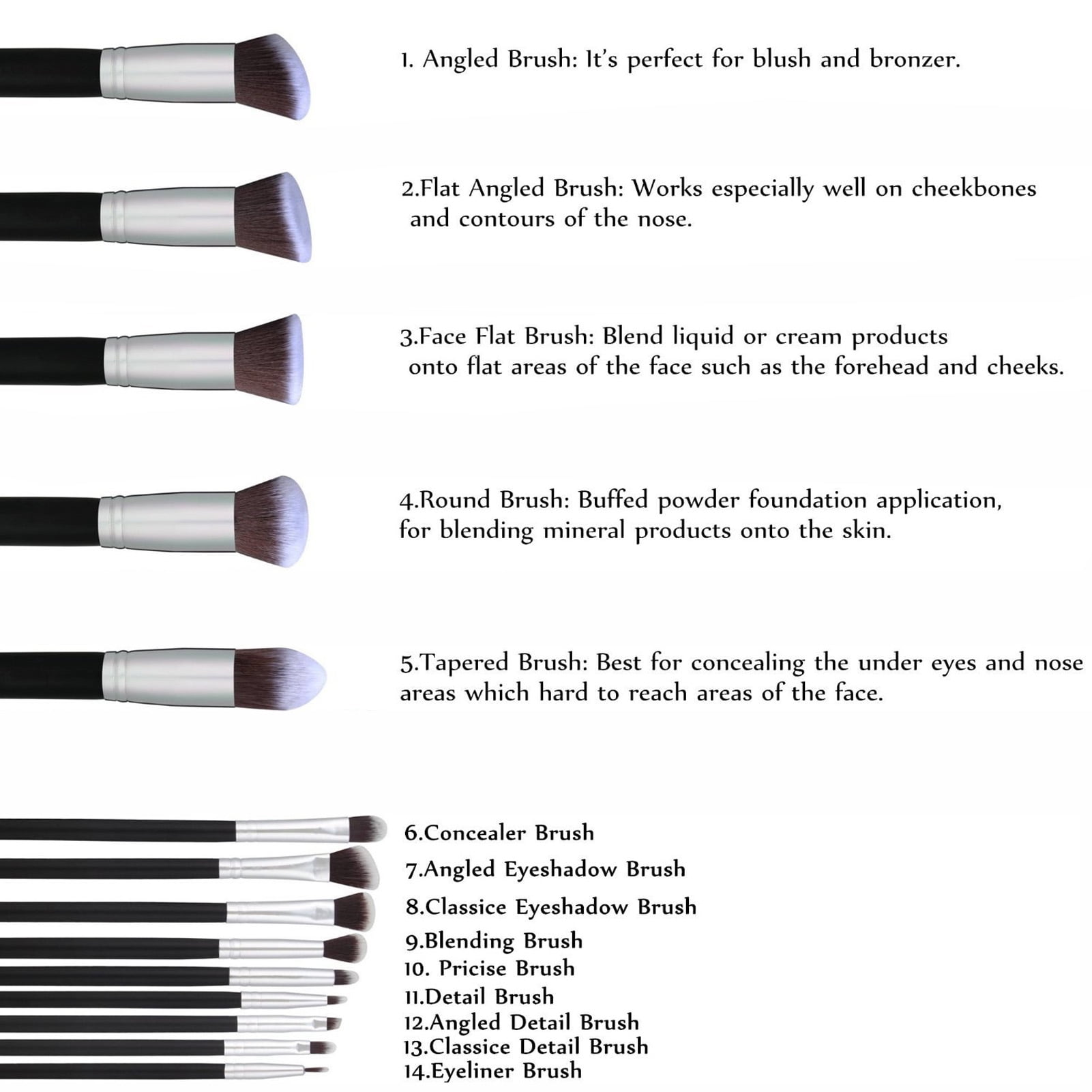 14 Pieces Makeup Brush Set:Blush Brush, Torch Brush, Flat Foundation Brush, Tapered Foundation Brush, Angled Contour Brush, Contour Brush, Powder Brush, Highlighter Brush,Tapered Highlighter Brush, Eye Shadow Brush, Small Eye Shadow Brush, Lip Brush, Eyeliner Brush,Precise Eyeliner Brush