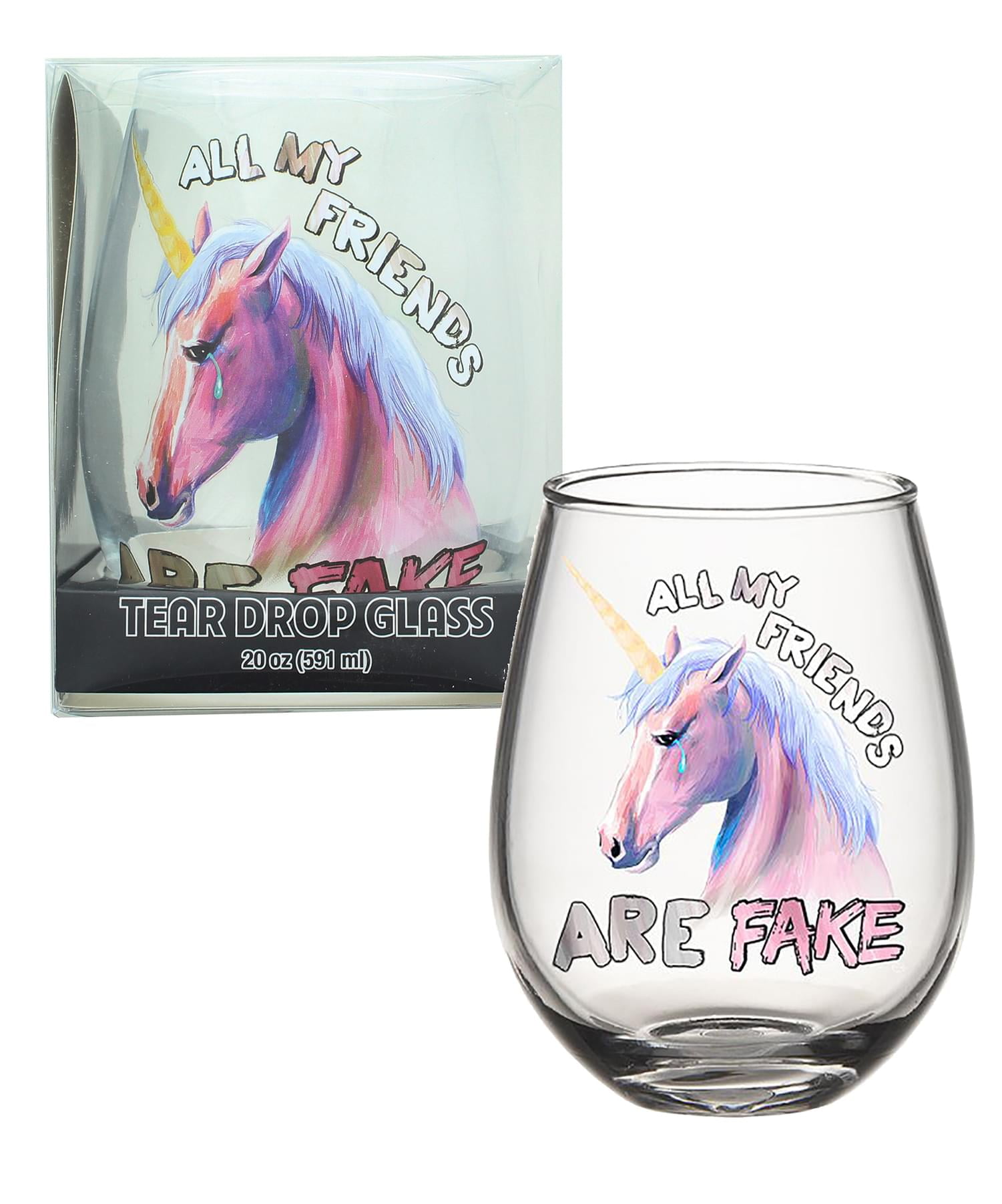 - FUN DESIGN: Clear glass features a crying pink unicorn with the text "All My Friends Are Fake".