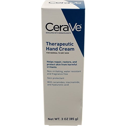 CeraVe Therapeutic Hand Cream 3 oz EachDeveloped with dermatologists, new CeraVe Therapeutic Hand Cream helps repair, restore and protect rough, dry, irritated hands, so they look and feel soft and healthy again. Formulated with essential ceramides, niacinamide and hyaluronic acid, the non-greasy cream helps repair your skin’s natural skin barrier while protecting from the harmful irritants and allergens that your hands encounter every day.