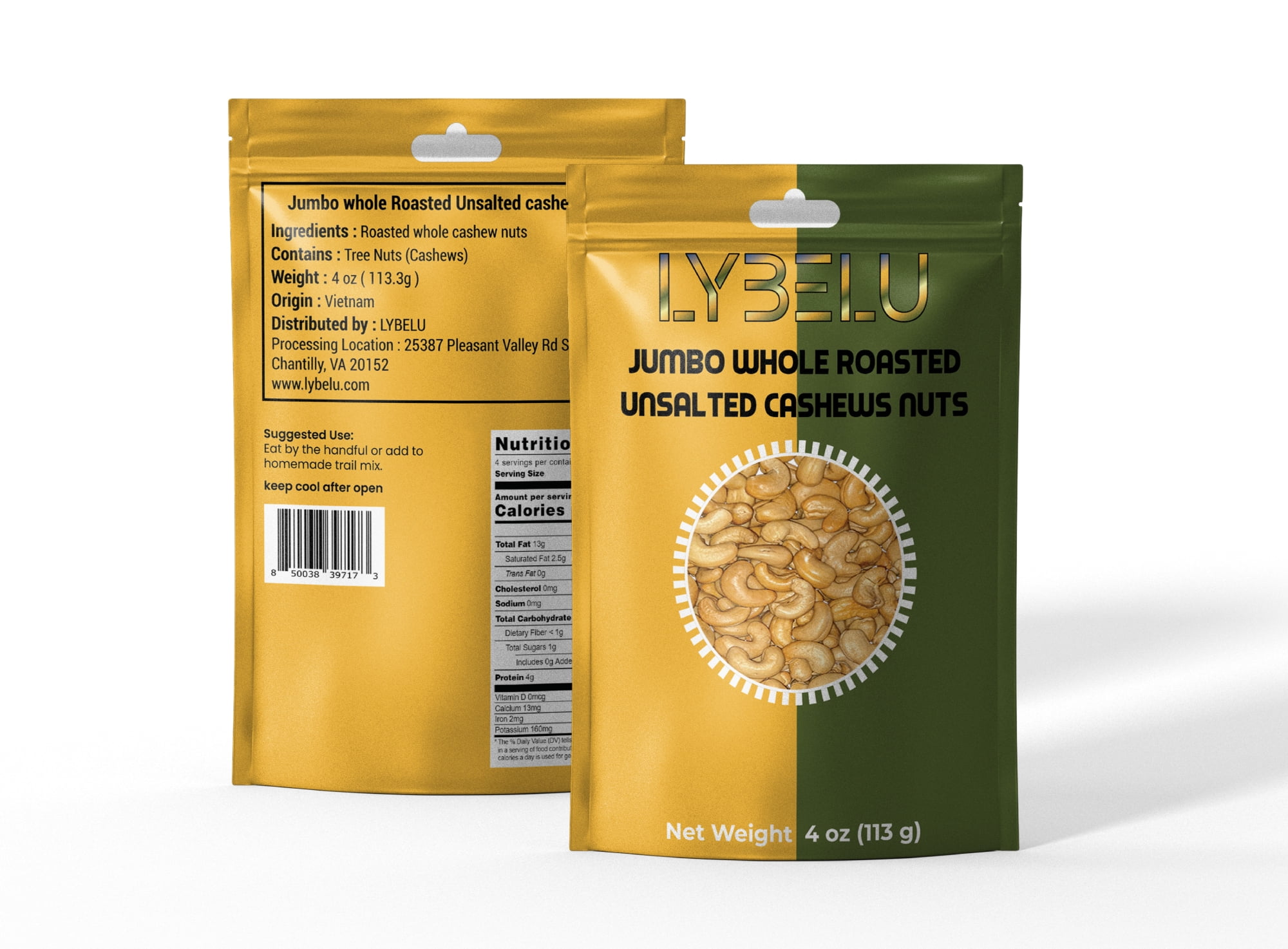 Lybelu Jumbo Whole Roasted Unsalted Cashews Nuts – 4oz