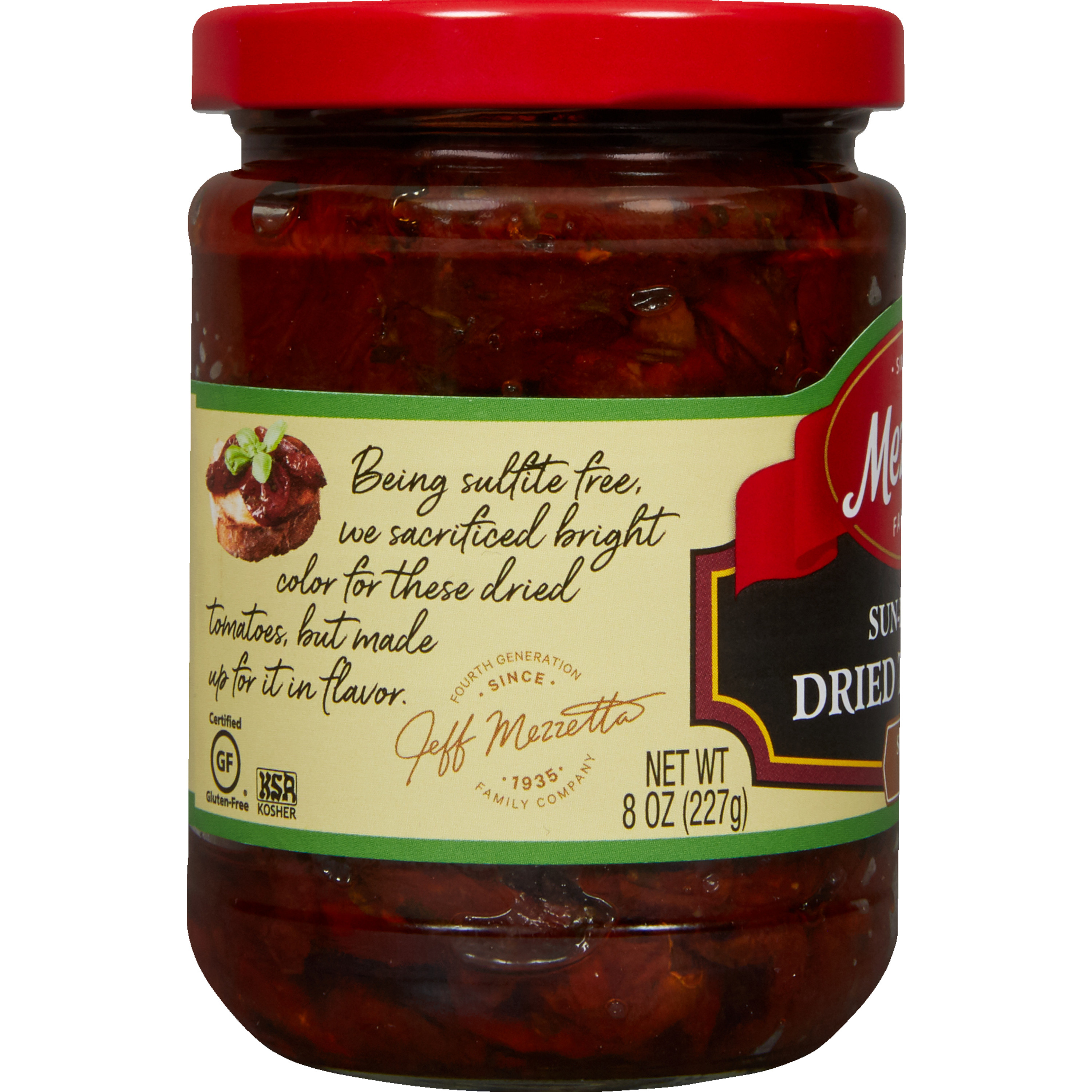 Mezzetta® Sun Ripened Dried Tomatoes contain no sulfites and are made with farm fresh, ripe California tomatoes. Soft and velvety in texture with more flavor than fresh tomatoes, they add a rich tangy taste to pasta, pizza, sandwiches and everything in between.