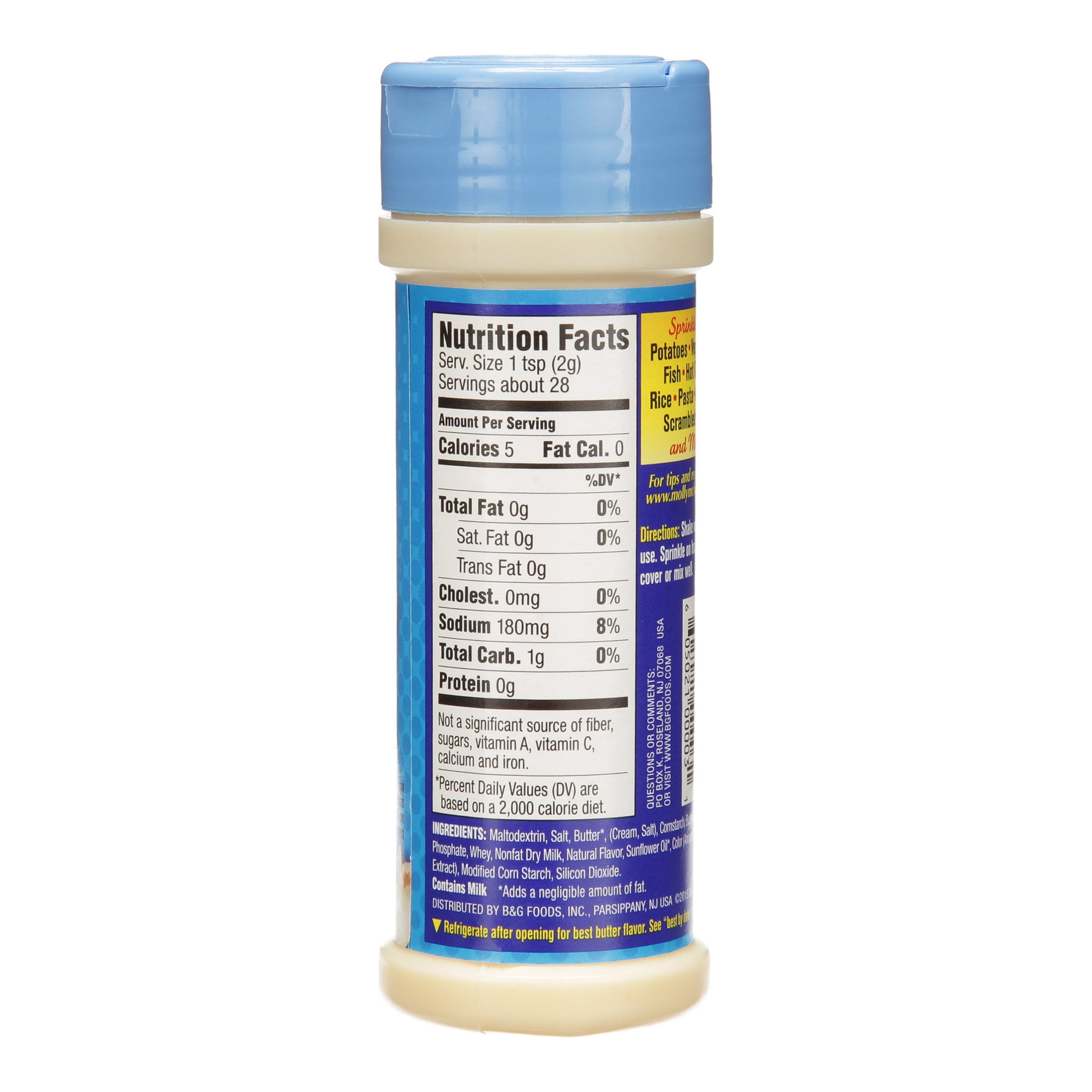 Molly McButter makes it easy to add a flavorful and fat-free twist to your favorite foods with just a few sprinkles! Add to vegetables, fish, hot cereal, rice, pasta, popcorn, scrambled eggs and more, as a substitute for butter or cheese.