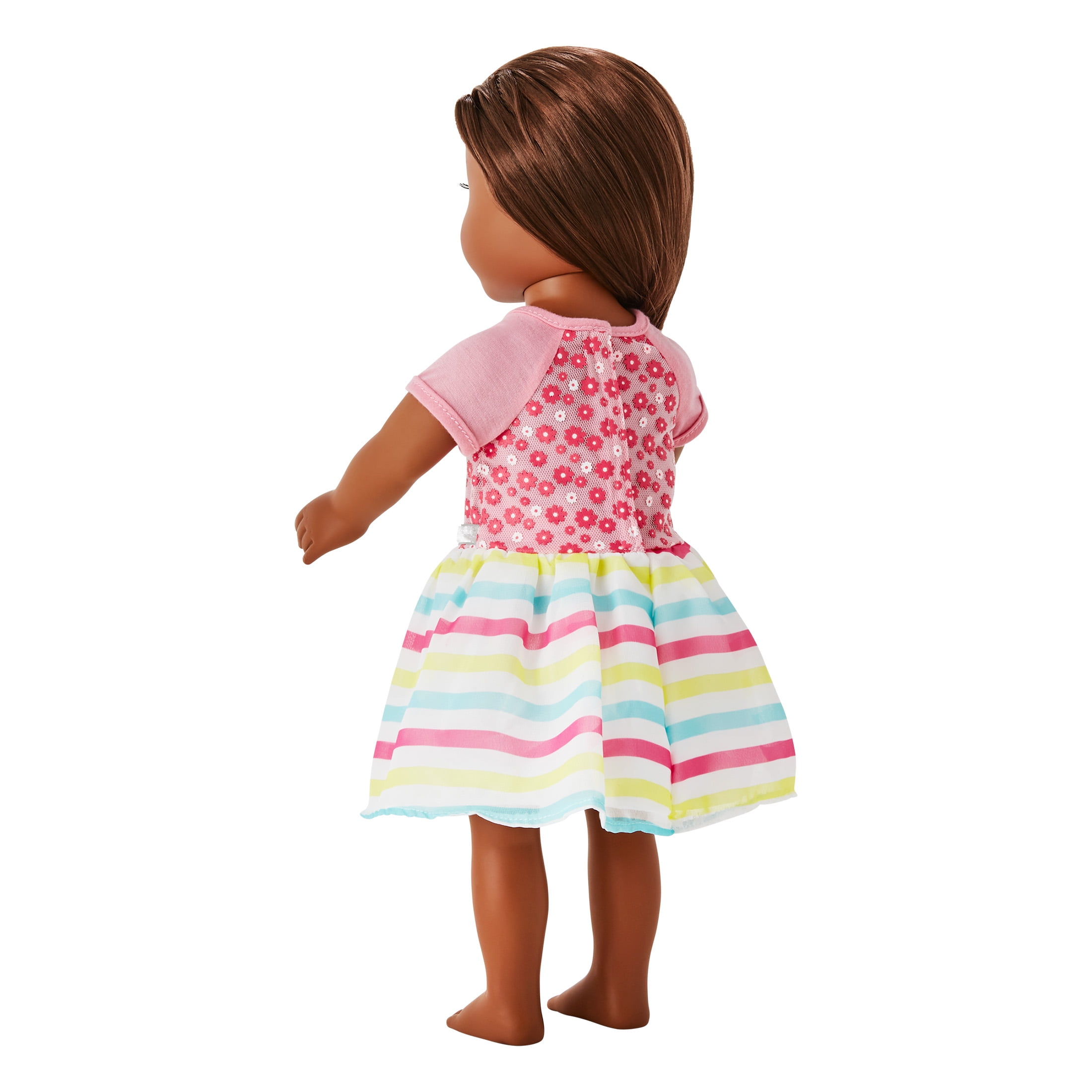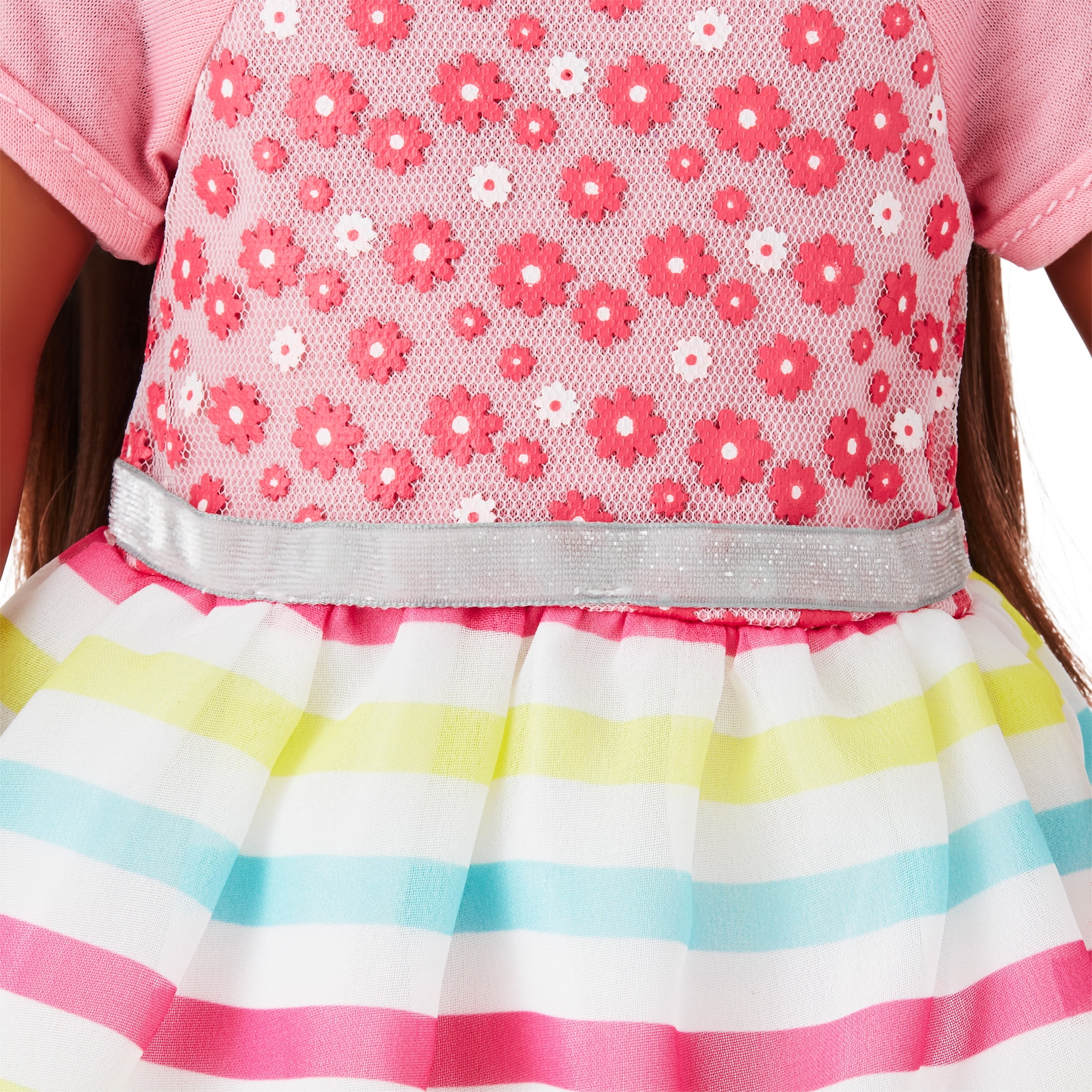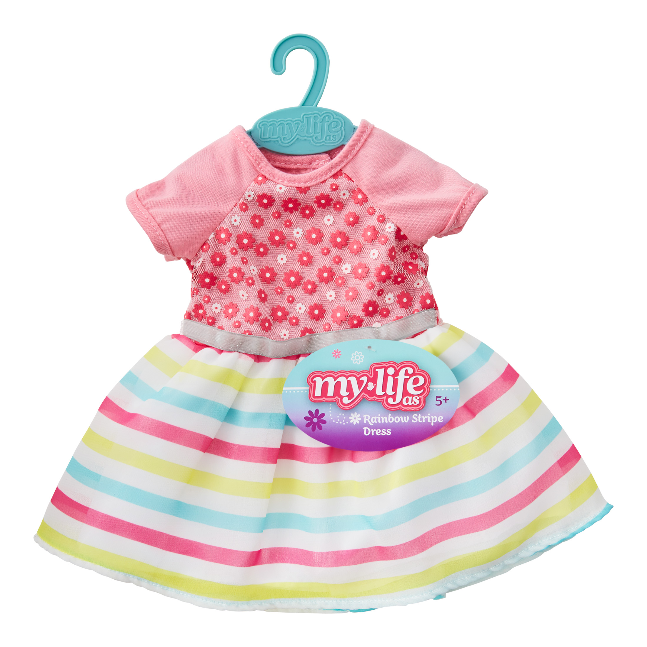 Whether it’s for a springtime stroll in the park or a playdate, your little one will love to dress their My Life As doll in the My Life As Rainbow Shadow Stripe Dress. This colorful dress features a striped skirt belted at the waist and a pink top dotted with pink and white daisies. It’s a great addition to the wardrobe of your little one’s 18” doll. The My Life As Rainbow Shadow Stripe Dress is a lovely outfit for your little one’s beloved doll, no matter what the occasion is! 18” doll not included.
