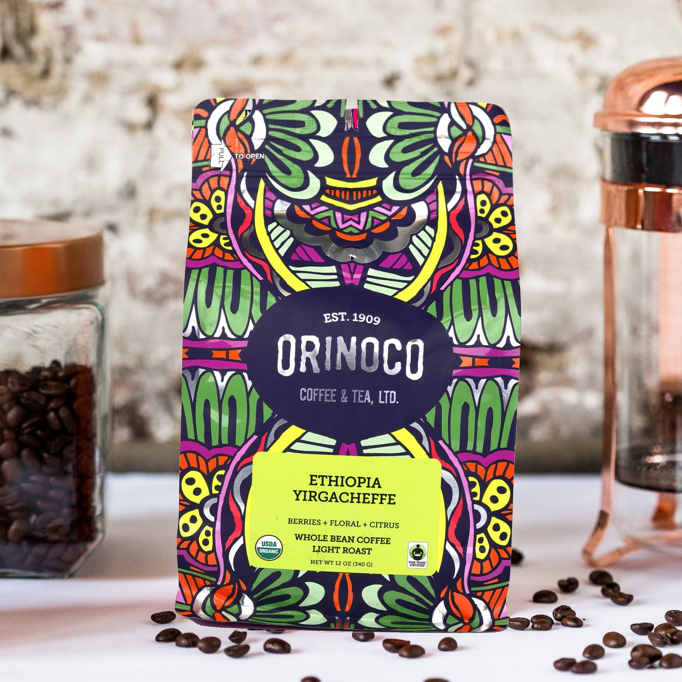 Orinoco, Ethiopia Yirgacheffe, Organic Fair Trade, Whole Bean Coffee, Light Roast 12 oz