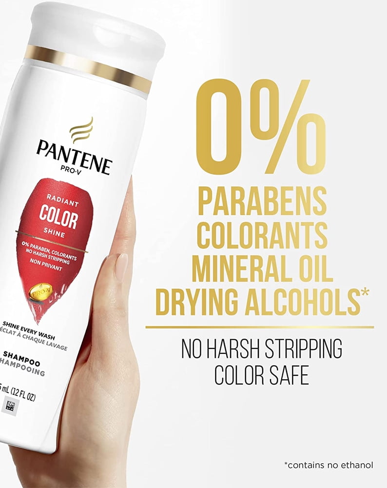 - 0% Paraben, colorants. No harsh stripping. Shine every wash. Hard working, long lasting. Radiant Color Sine Pro-V Formula cleanses color treated hair to remove build up without stripping & primes strands for optimal moisture & shine. Pro-V Nutrients: Protective Anti-Oxidants, Pro-Vitamin B5, pH Balancers. Safe On: Color treated hair, chemically treated hair. www.pantene.com. how2recycle.info. Questions? 1-800-945-7768 or visit www.pantene.com. Made in U.S.A. of U.S. and/or Imported Ingredients.