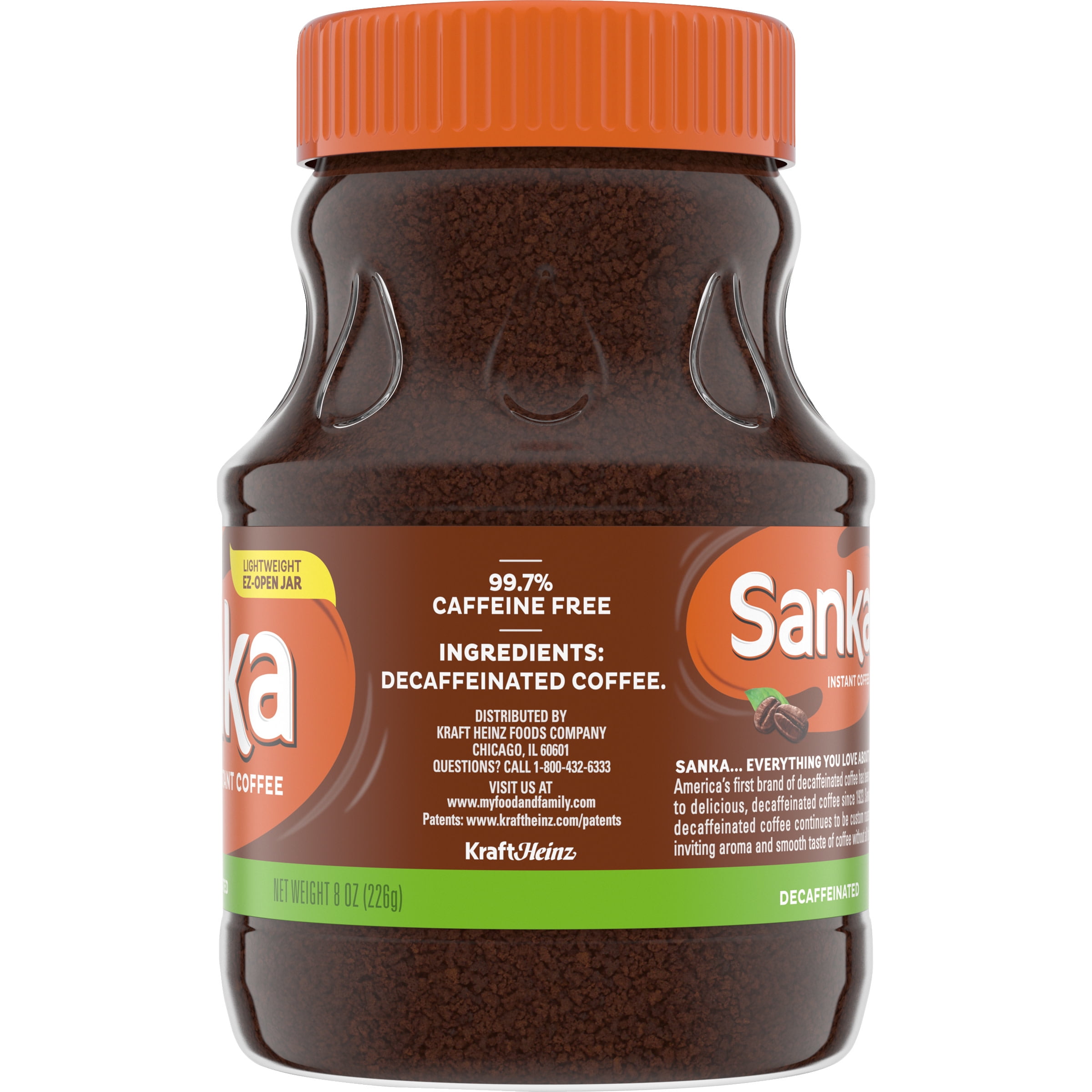 Sanka Decaffeinated Instant Coffee delivers superb flavor without the caffeine. This decaffeinated coffee is 99.7% caffeine free so you can relax and rest easy. Add one teaspoon of Sanka decaffeinated instant coffee to 6 fluid ounces of boiling water and stir. To prepare in your microwave, mix decaf coffee and 3/4 cup of cold water in a large microwave-safe cup or mug, then heat it on high for two minutes or until steaming hot. Use more or less coffee to suit your taste. Close the jar tightly after each use, and refrigerate to best preserve flavor.