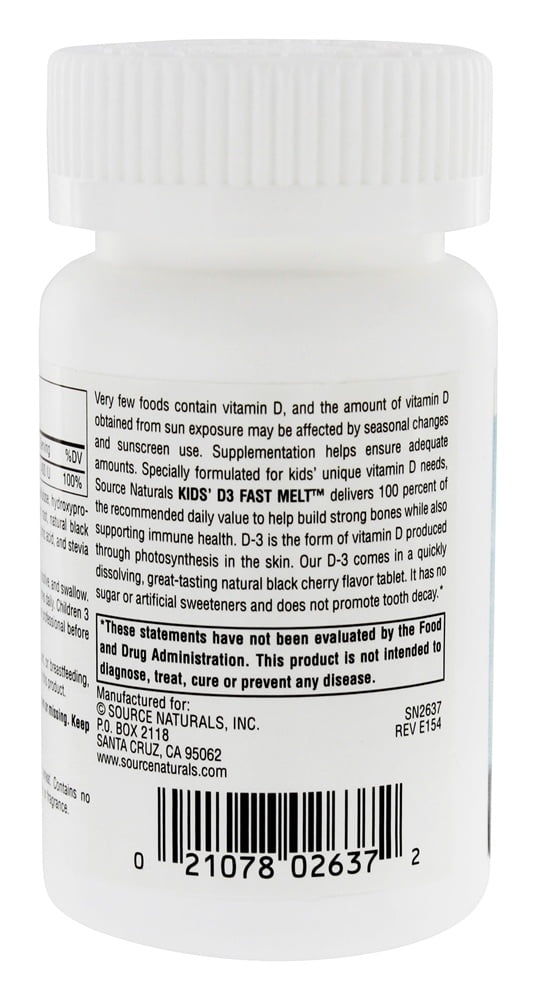 Source Naturals – Kids’ D-3 Fast Melt Black Cherry 400 IU – 200 Tablets Source Naturals Kids’ D-3 Fast Melt Black Cherry delivers 100 percent of the recommended daily value to help build strong bones while also supporting immune health. D-3 is the form of vitamin D produced through photosynthesis in the skin. Source Naturals Kids’ D-3 comes in a quickly dissolving, great-tasting naturalKids D-3 400 IU Source Naturals, Inc. 200 Sublingual Tablet