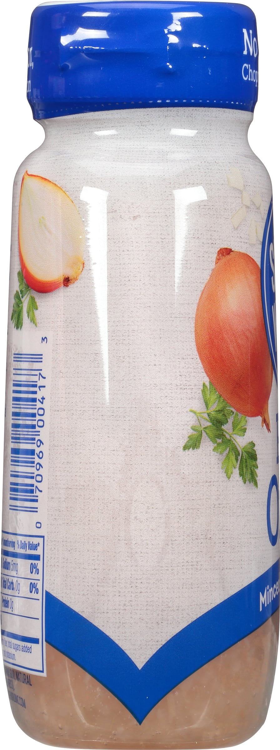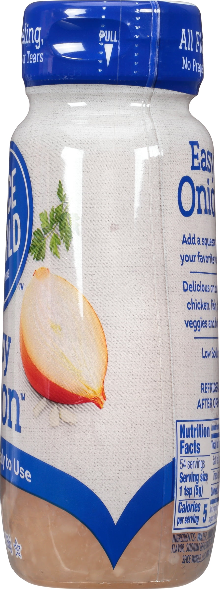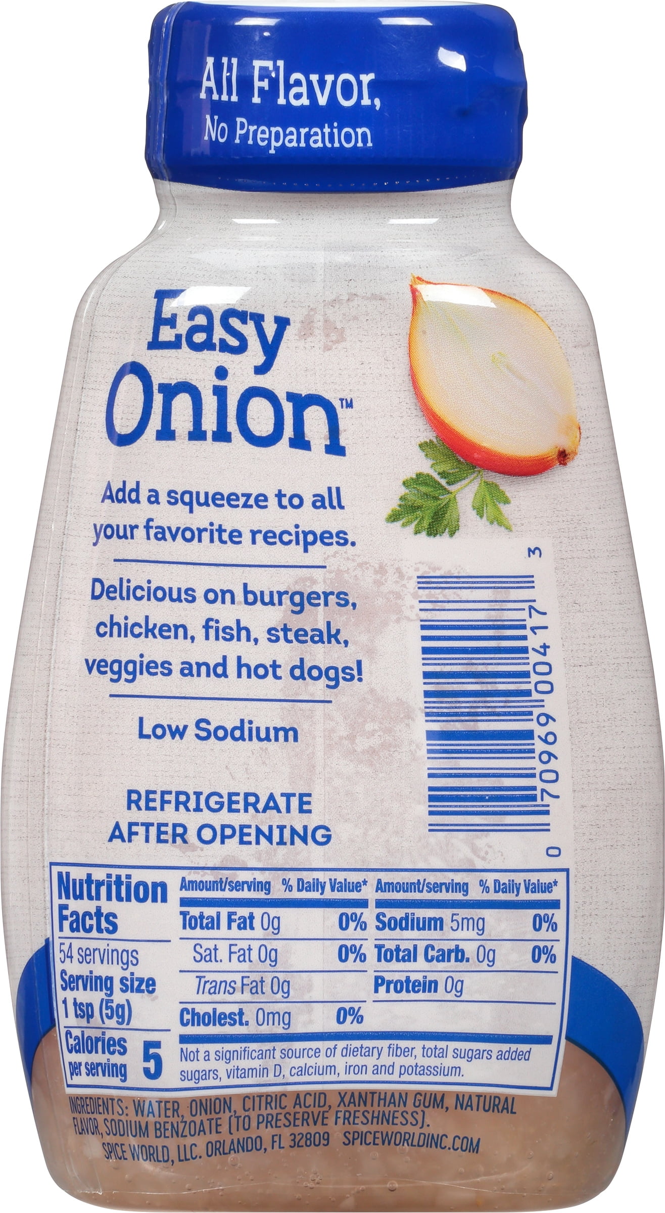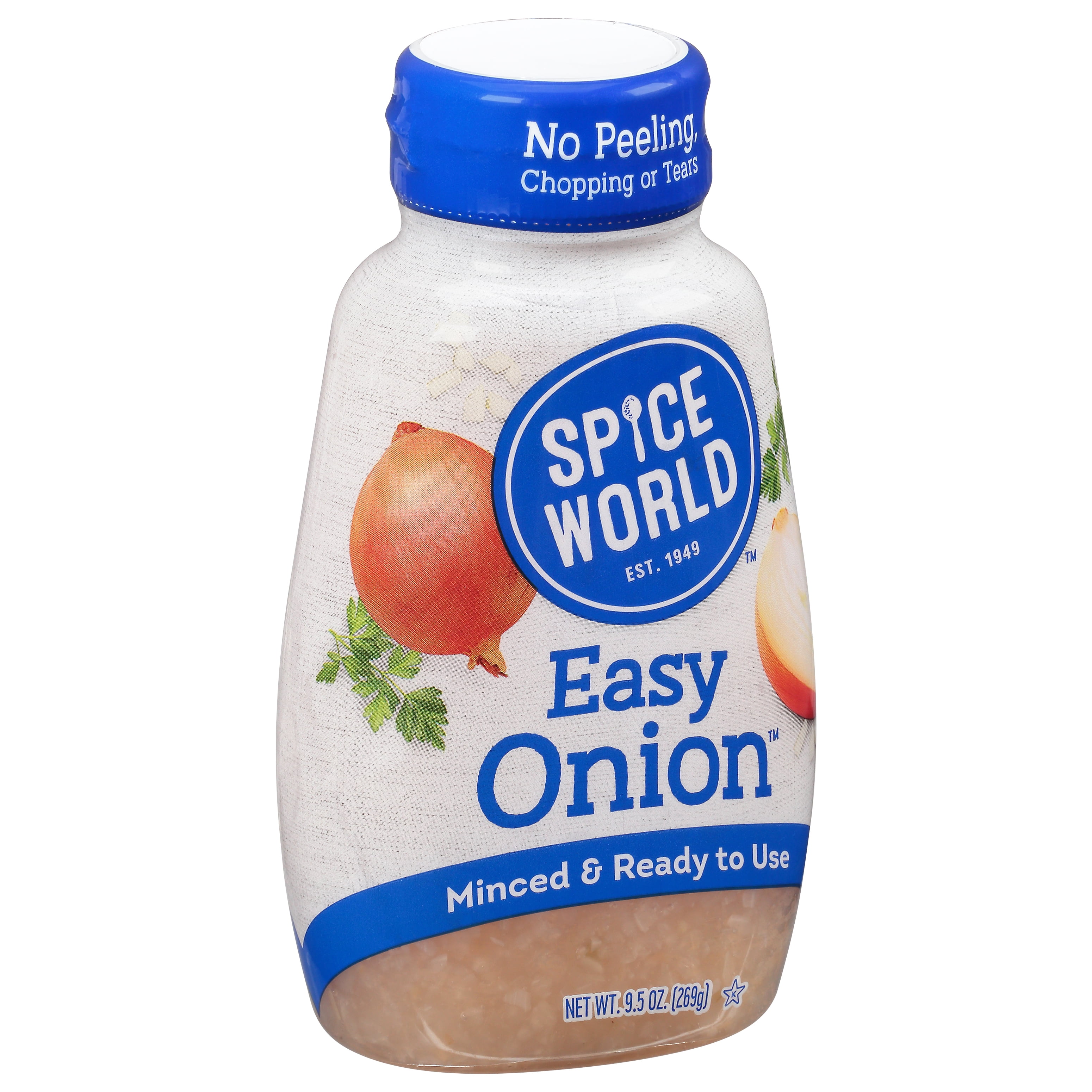Spice World Squeezable 9.5oz Minced Onion is the perfect addition to pack in your picnic basket for an outdoor party, add to your cooler for a tailgate this fall, or keep in your fridge to make meal prep easy! Delicious on burgers, chicken, fish, steak, veggies, and hot dogs! It is ready-to-use and comes in a convenient squeeze bottle to use just the right amount for your dish. No peeling, chopping, or tears. Please refrigerate after opening and shake well.
