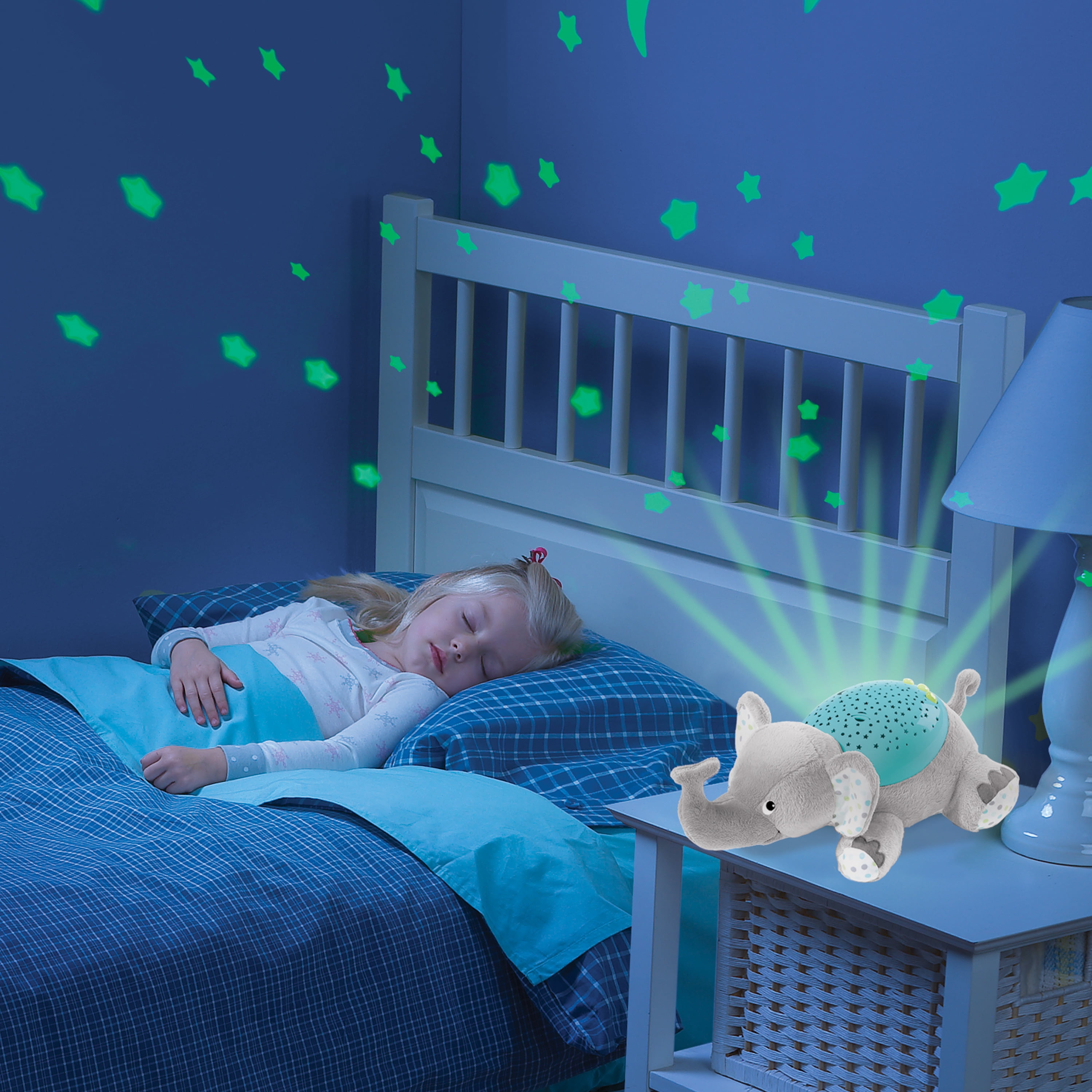 - CONVENIENT DESIGN: The Slumber Buddies elephant baby projector night light with music features a flat base for stationary use on your child’s nightstand or dresser.
