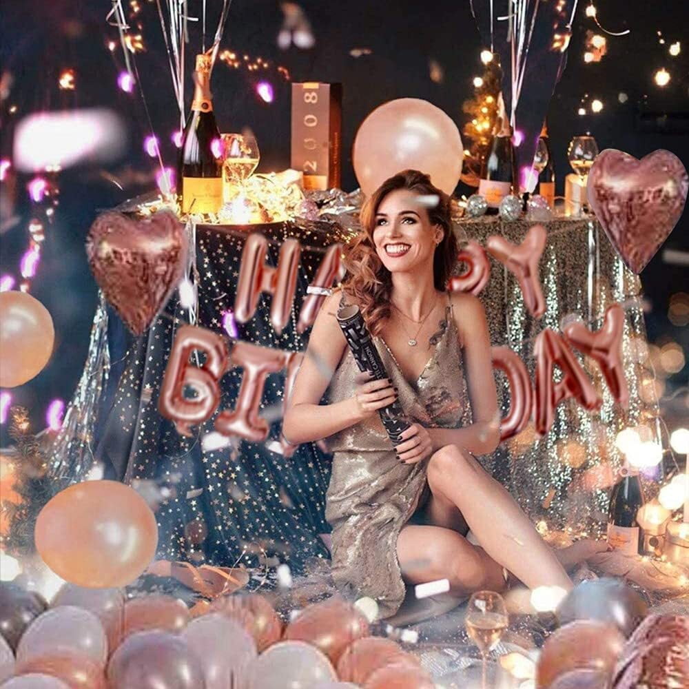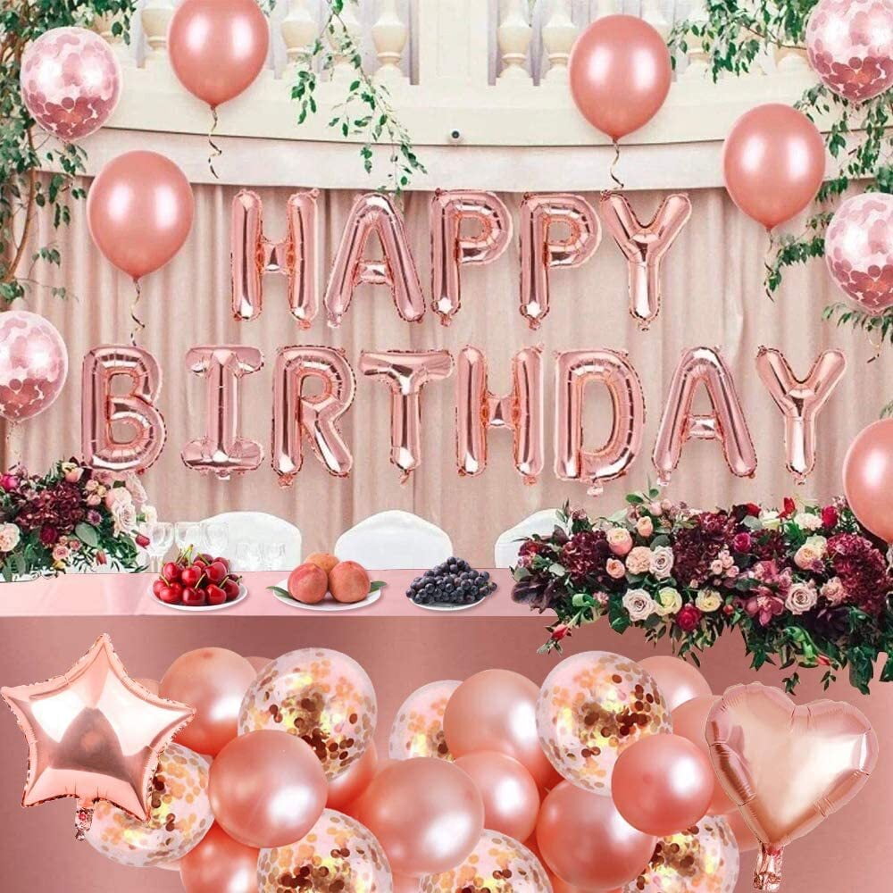 - 【Rose Gold Party Decorations Set】Rose gold “HAPPY BIRTHDAY” balloons x1, Rose gold latex balloons( 5”x10, 10”x10, 12”x20), 12" confetti balloons x10, 18” rose gold star foil balloons x2, 18” heart foil balloons x2, ribbons x3,balloon chain x1, table cloth x1, candle x1,cake topper x1