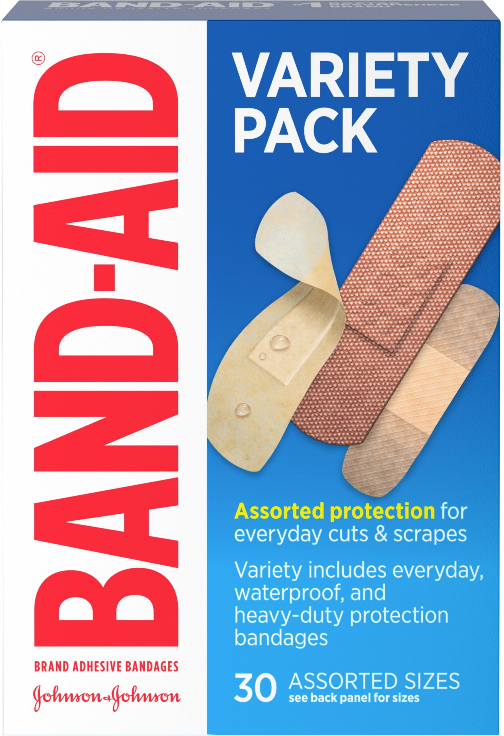 Product Description Band-Aid Brand Adhesive Bandages Family Variety Pack provides first aid protection for minor cuts, scrapes, and wounds. This variety pack contains adhesive bandages from the #1 doctor recommended brand including Water Block Flex, Skin-Flex, and Tough Strips Bandages. The Water Block Flex bandages feature an ultra-flexible, 100% waterproof design with fabric-like comfort, and they stay on even when wet. Tough Strips Heavy-Duty Bandages are made of durable Dura-Weave fabric with a strong adhesive that stays in place for up to 24 hours. Skin-Flex Bandages with MotionMax Technology expand and contract for the ultimate skin-like fit, even during activity, and provide a durable hold that lasts through handwashing. For best results, apply these sterile adhesive bandages to clean, dry skin and replace as needed. For infection protection, apply Neosporin First Aid Antibiotic to wound before covering with Band-Aid Brand Adhesive Bandage. Key features 30-count box of Band-Aid Brand Adhesive Bandage Variety Pack containing 3 different types of bandages including, Water Block Flex, Skin-Flex, and Tough Strips Bandages to help provide first aid wound care of minor cuts, scrapes and wounds Includes 10 Water Block Flex Bandages that are 100% waterproof and stay on even when wet and feature an ultra-flexible design with fabric-like comfort Includes 10 Skin-Flex Bandages which expand and contract with MotionMax Technology for the ultimate skin-like fit. With a durable hold that lasts through handwashing, the flexible bandages allow for active movement Includes 10 Skin-Flex Bandages with MotionMax Technology, expanding and contracting for the ultimate skin-like fit. With a durable hold that lasts through handwashing, the flexible bandages allow for active movement Superior first-aid wound care from the #1 doctor recommended brand. For best results, apply these sterile adhesive bandages to clean, dry skin and replace as needed. For infection protection, use this product along with Neosporin First Aid Antibiotic Directions/uses For best results, apply bandage to clean dry skin. Change bandage daily, when wet, or more often if needed. TOUGH STRIPS ® are not intended for use on delicate or sensitive skin. ? 866-565-2873; Outside US, dial collect 215-273-8755. www.band-aid.com Warnings For medical emergencies seek professional help. STERILE unless individual wrapper is opened or damaged Not made with natural rubber latexBand-Aid Brand Adhesive Bandages Variety Pack, Assorted Sizes, 30 ct 1 ea