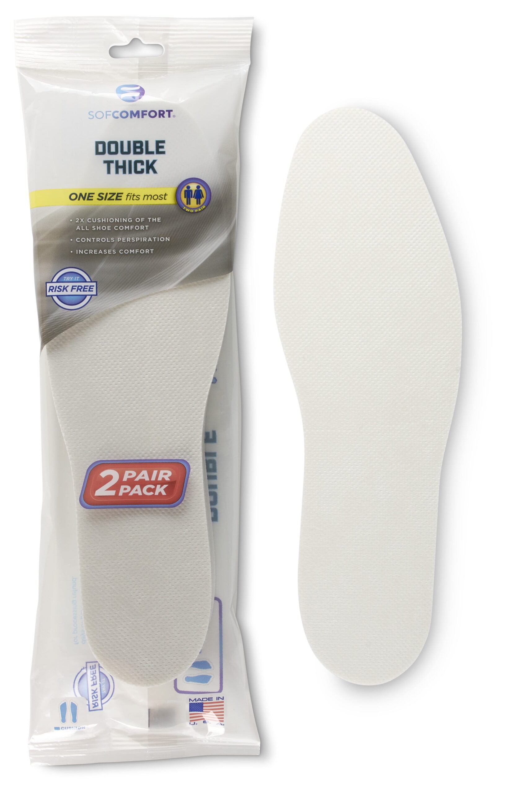 The Double Thick Insole has 2X cushioning of the All Shoe Comfort insole. It helps absorb shock while increasing the comfort of your favorite shoes. Includes 2 pairs of insoles.