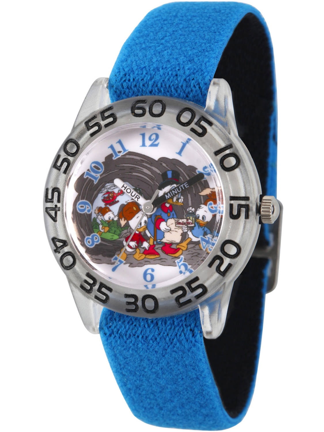 Duck Tales Scrooge Mc Duck, Dewey, Huey, Louie, Launchpad McQuack Boys’ Clear Plastic Time Teacher Watch, Reversible Blue and Black Nylon Strap