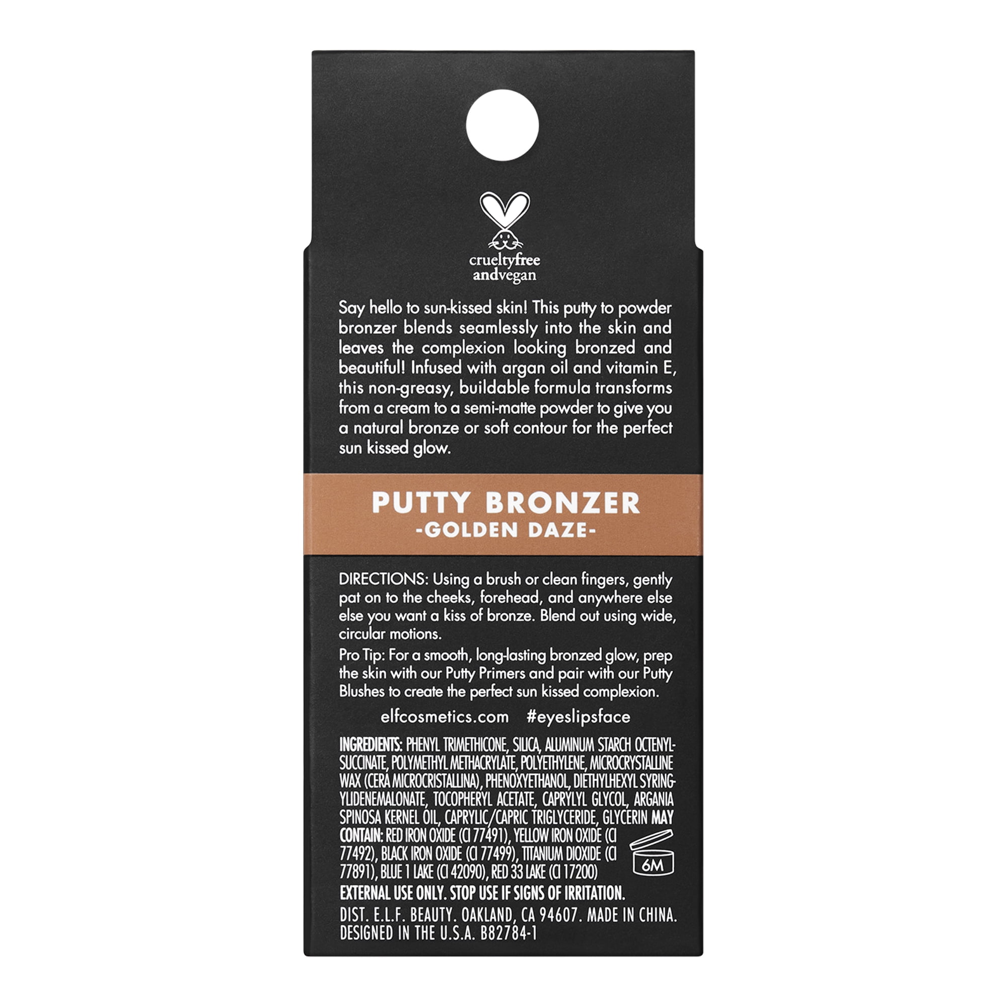 Bask in that sun-kissed, back-from-vacation glow all year round. This unique creamy putty-to-powder bronzer effortlessly blends and blurs into skin, delivering a natural bronzing effect with a smooth, semi-matte finish. e.l.f.’s Putty Bronzer is lightweight, non-greasy, and packed with pigment, letting you build an all-over warm complexion or just a kiss of golden hour contour. Plus, the formula is infused with Argan Oil and Vitamin E for moisturizing, nourishing, and skin-loving benefits while you glow.
