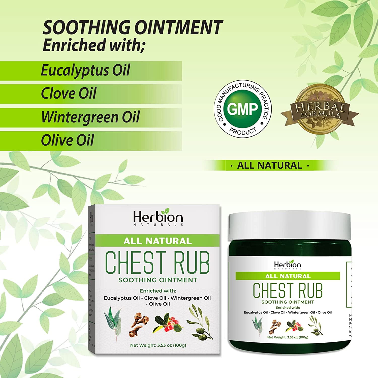 - NATURAL, POWERFUL INGREDIENTS Herbion Naturals Chest Rub is enriched with strong Menthol, and essential Eucalyptus, Clove, Wintergreen, Blue Gum, and Olive Oils.